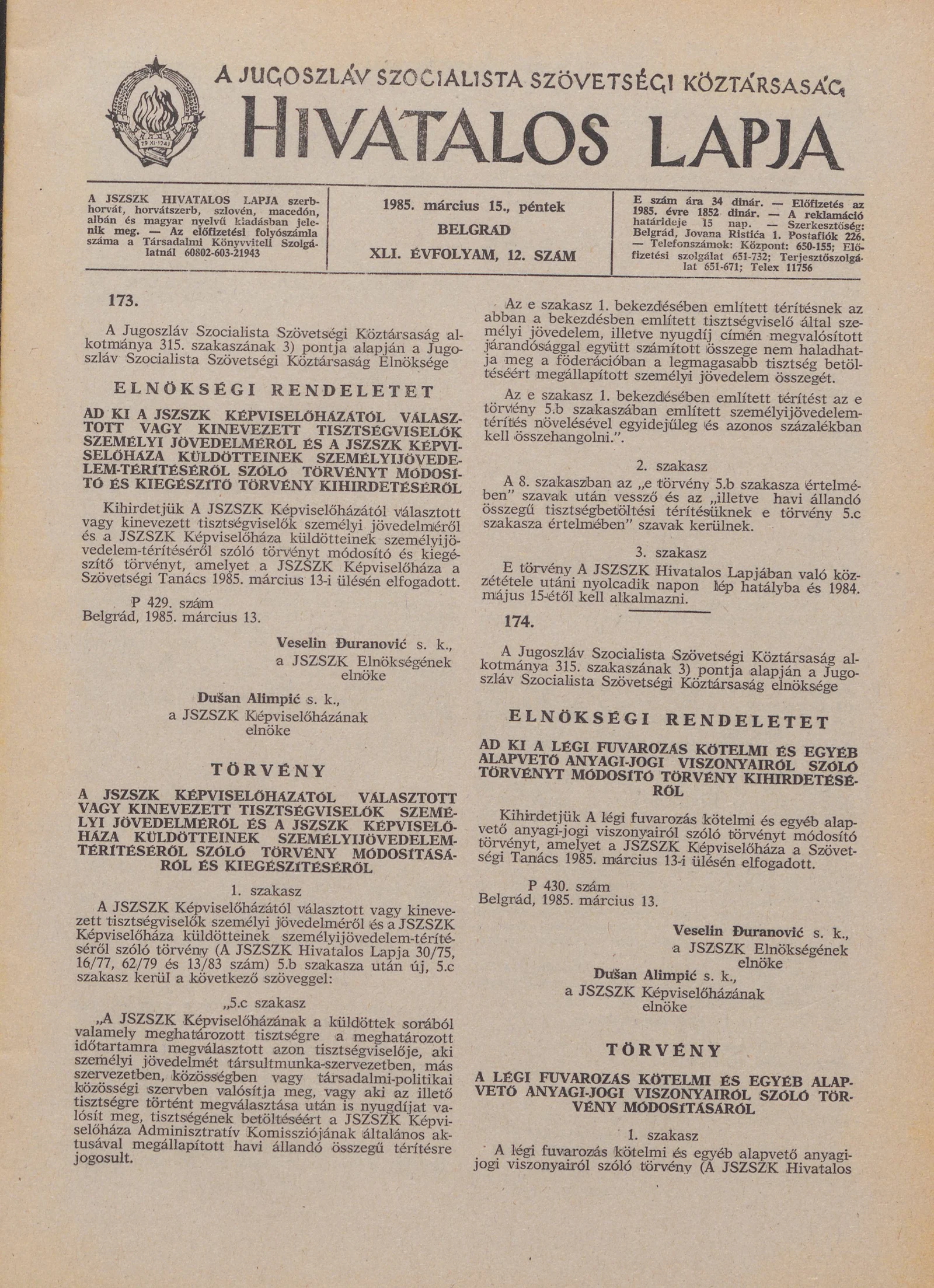 - Törvény A JSZSZK Képviselőházától választott vagy kinevezett tisztségviselők személyi jövedelméről és a JSZSZK Képviselőháza küldötteinek személyi jövedelem-térítéséről szóló törvény módosításáról és kiegészítéséről 505