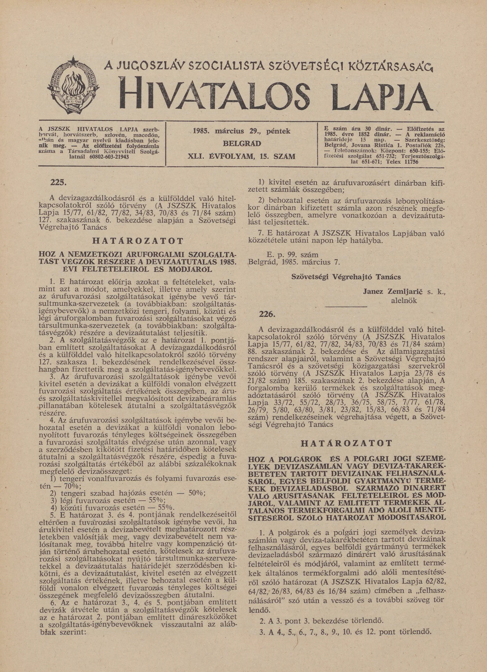 - Határozat A polgárok és a polgári jogi személyek devizaszámlán vagy deviza-takarékbetéten tartott devizáinak felhasználásáról, egyes belföldi gyártmányú termékek devizaeladásból származó dinárért való árusításának feltételeiről és módjáról, valamin...629