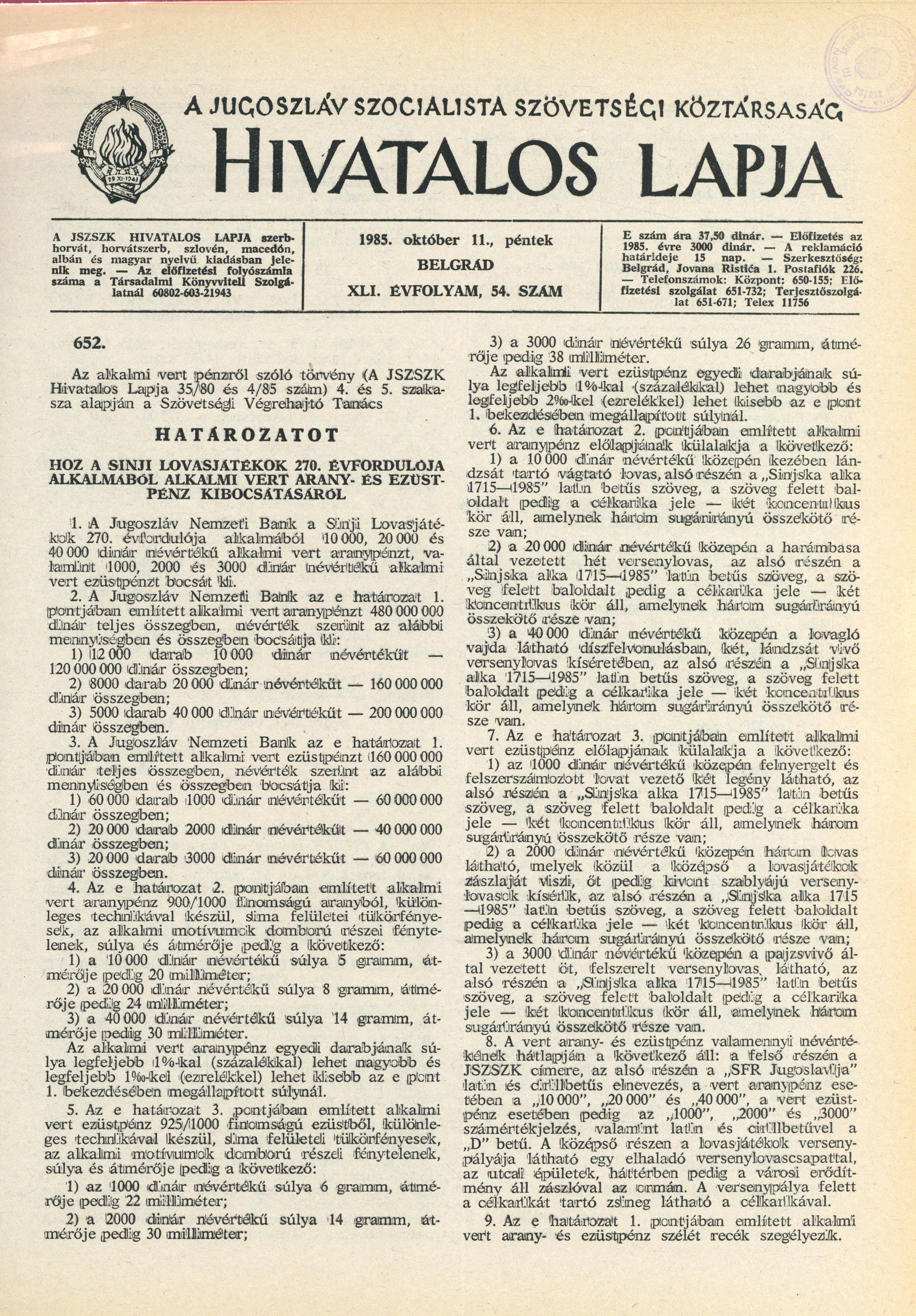 A Jugoszláv Szocialista Szövetségi Köztársaság Hivatalos Lapja, 41. évf. 1985. október 11. 54. sz. 1449–1468. oldal