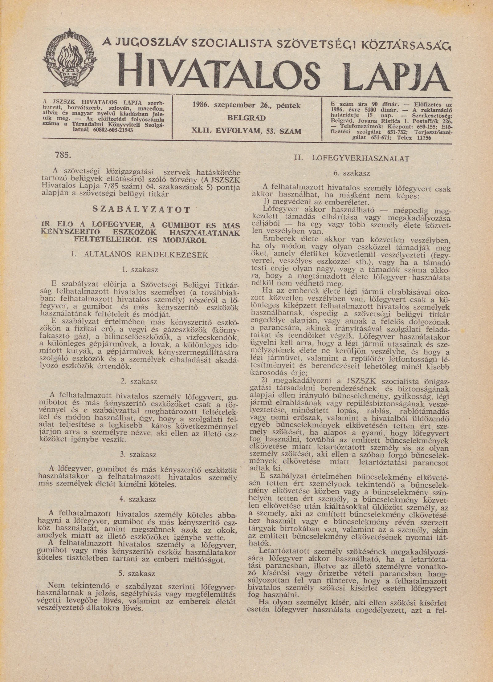 A Jugoszláv Szocialista Szövetségi Köztársaság Hivatalos Lapja, 42. évf. 1986. szeptember 26. 53. sz. 1605–1616. oldal