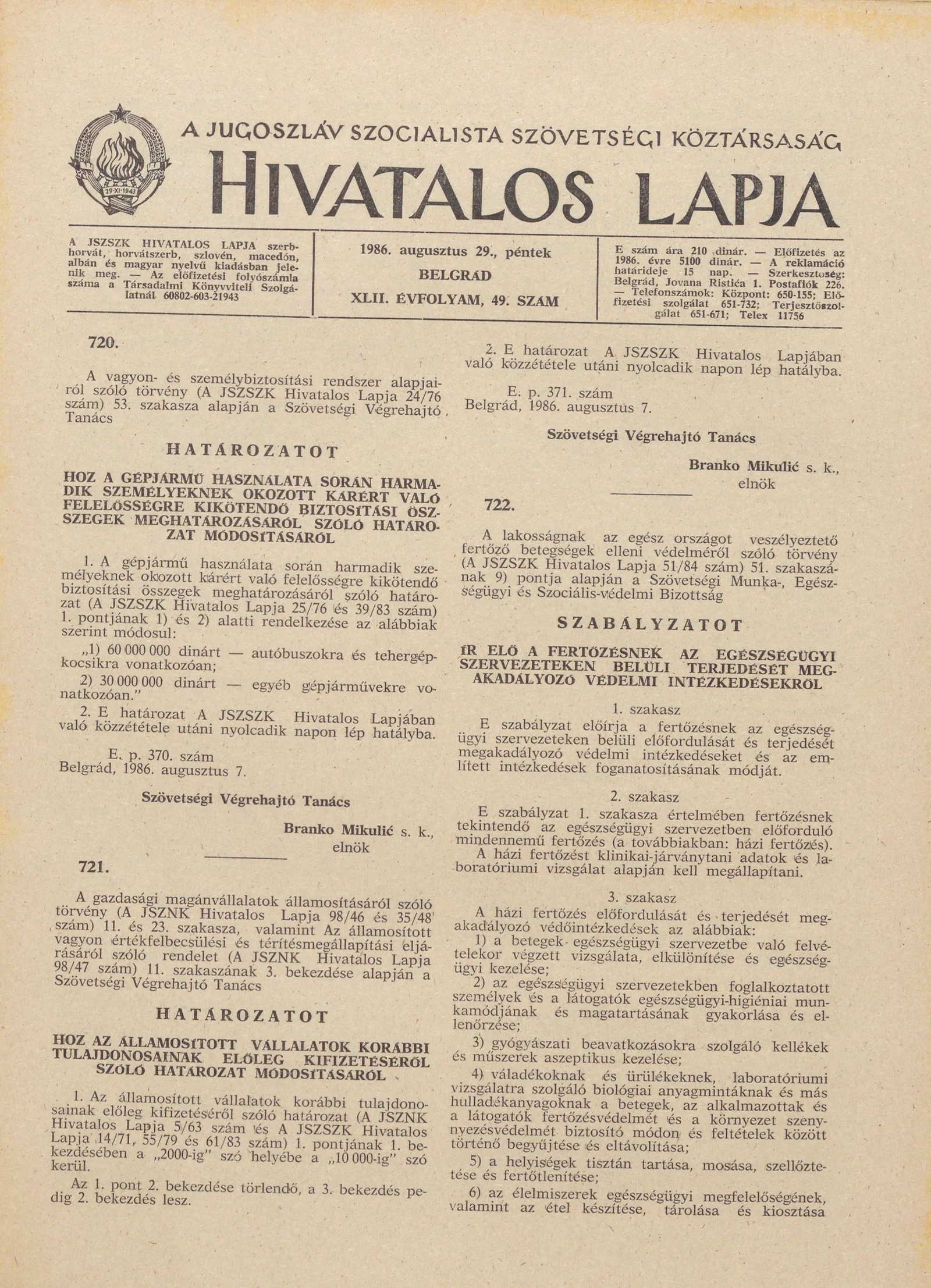 A Jugoszláv Szocialista Szövetségi Köztársaság Hivatalos Lapja, 42. évf. 1986. augusztus 29. 49. sz. 1469–1496. oldal
