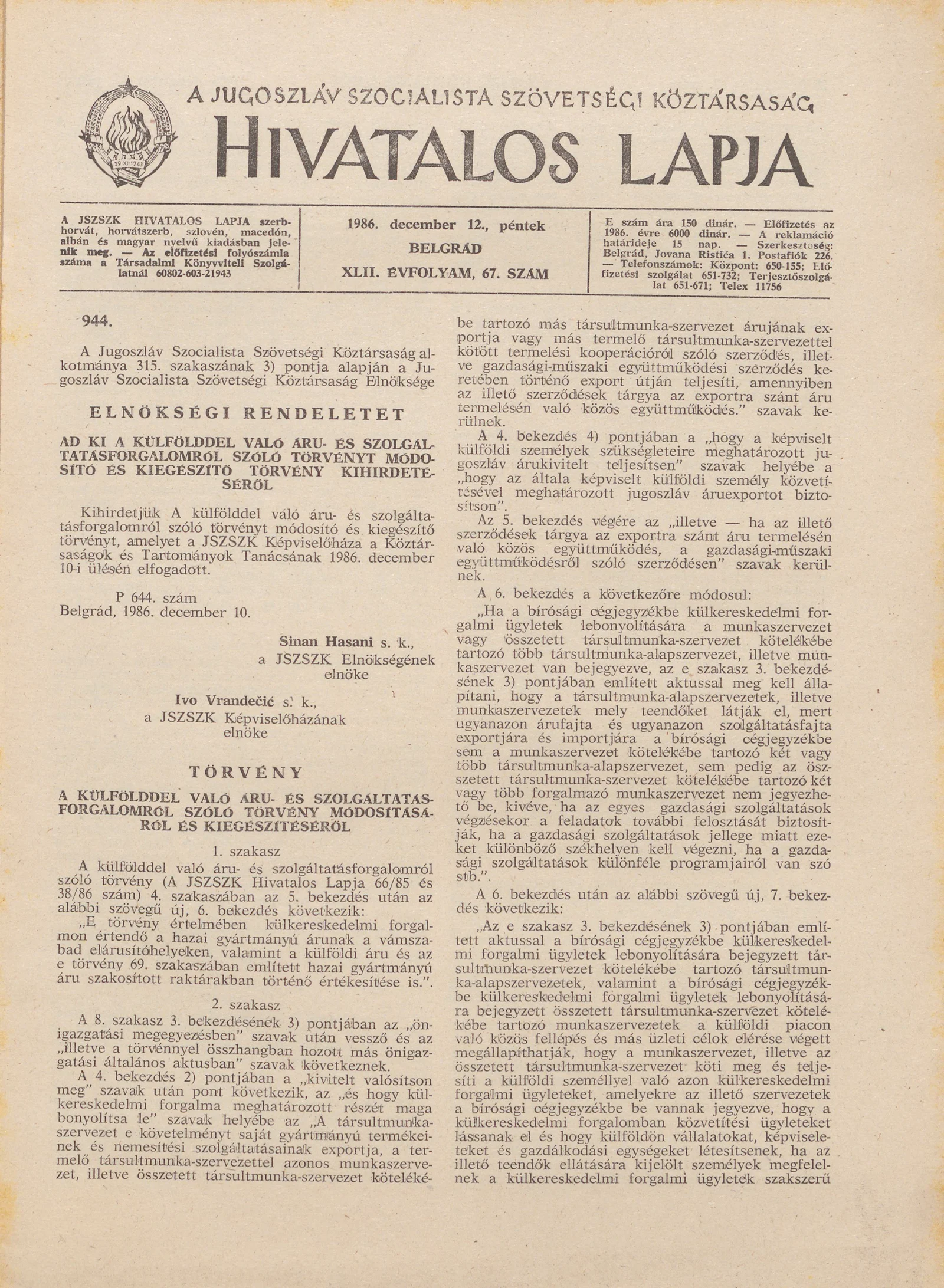 A Jugoszláv Szocialista Szövetségi Köztársaság Hivatalos Lapja, 42. évf. 1986. december 12. 67. sz. 2009–2028. oldal