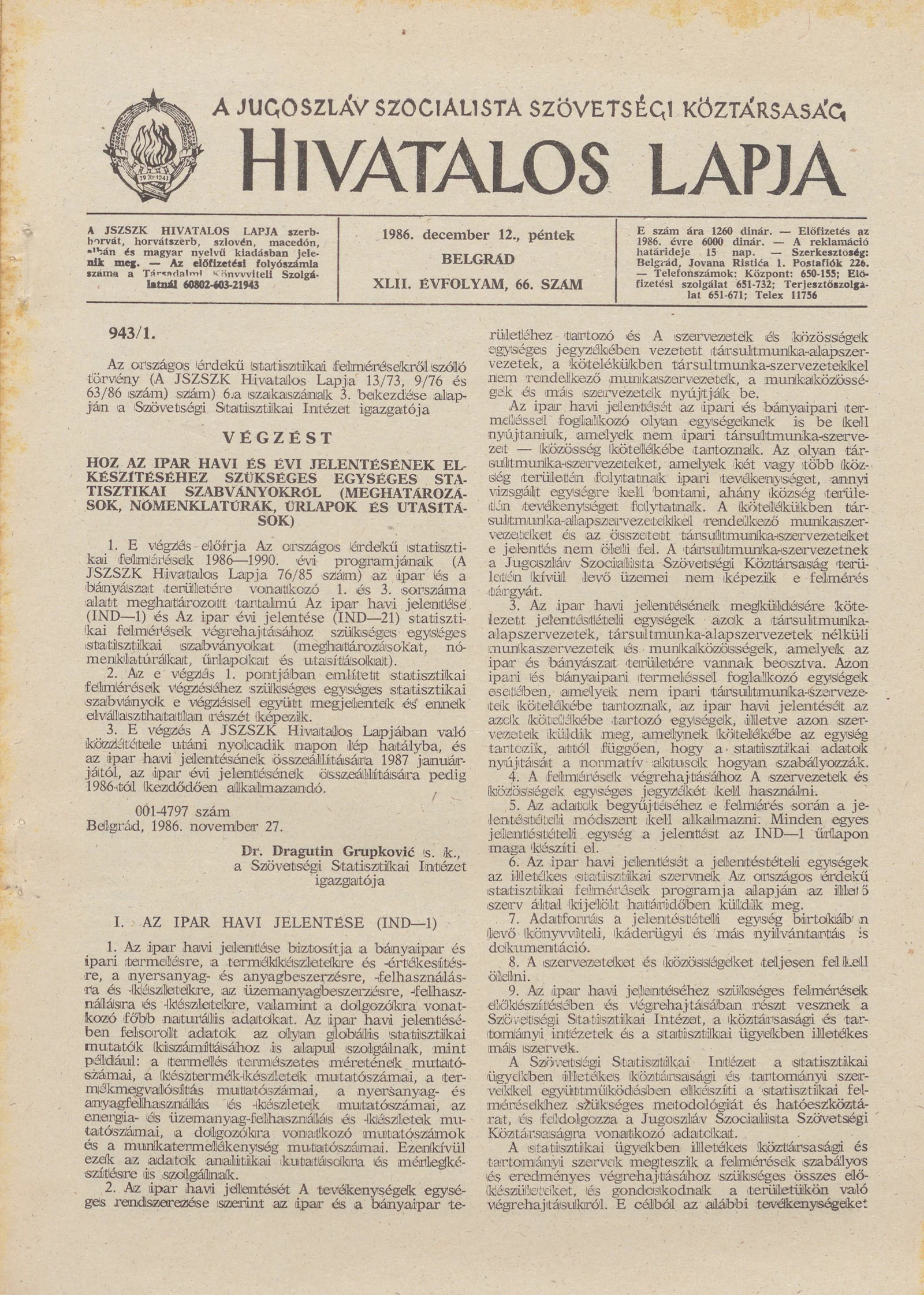 A Jugoszláv Szocialista Szövetségi Köztársaság Hivatalos Lapja, 42. évf. 1986. december 12. 66. sz. 1881–2024. oldal