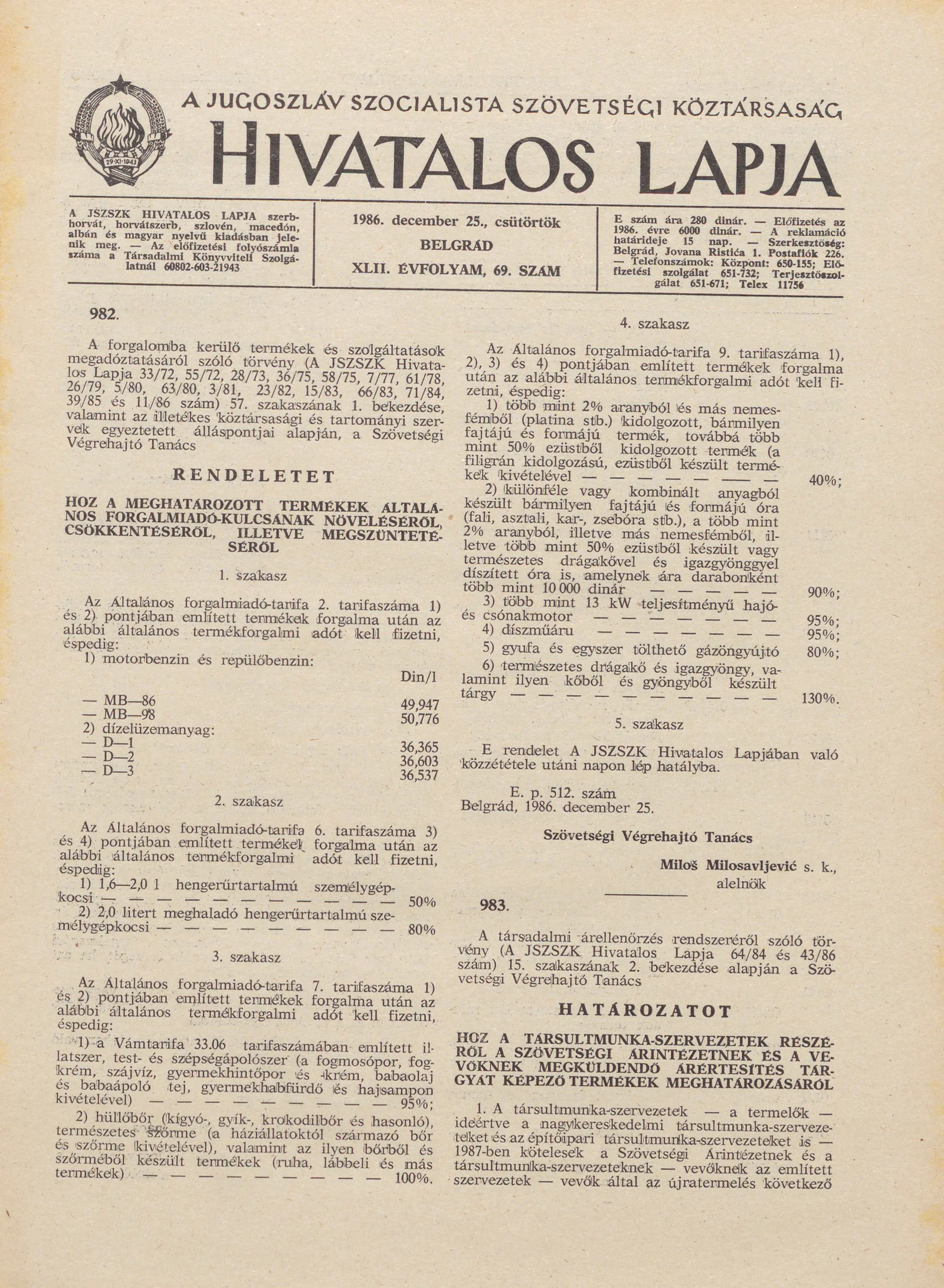 A Jugoszláv Szocialista Szövetségi Köztársaság Hivatalos Lapja, 42. évf. 1986. december 25. 69. sz. 2041–2072. oldal