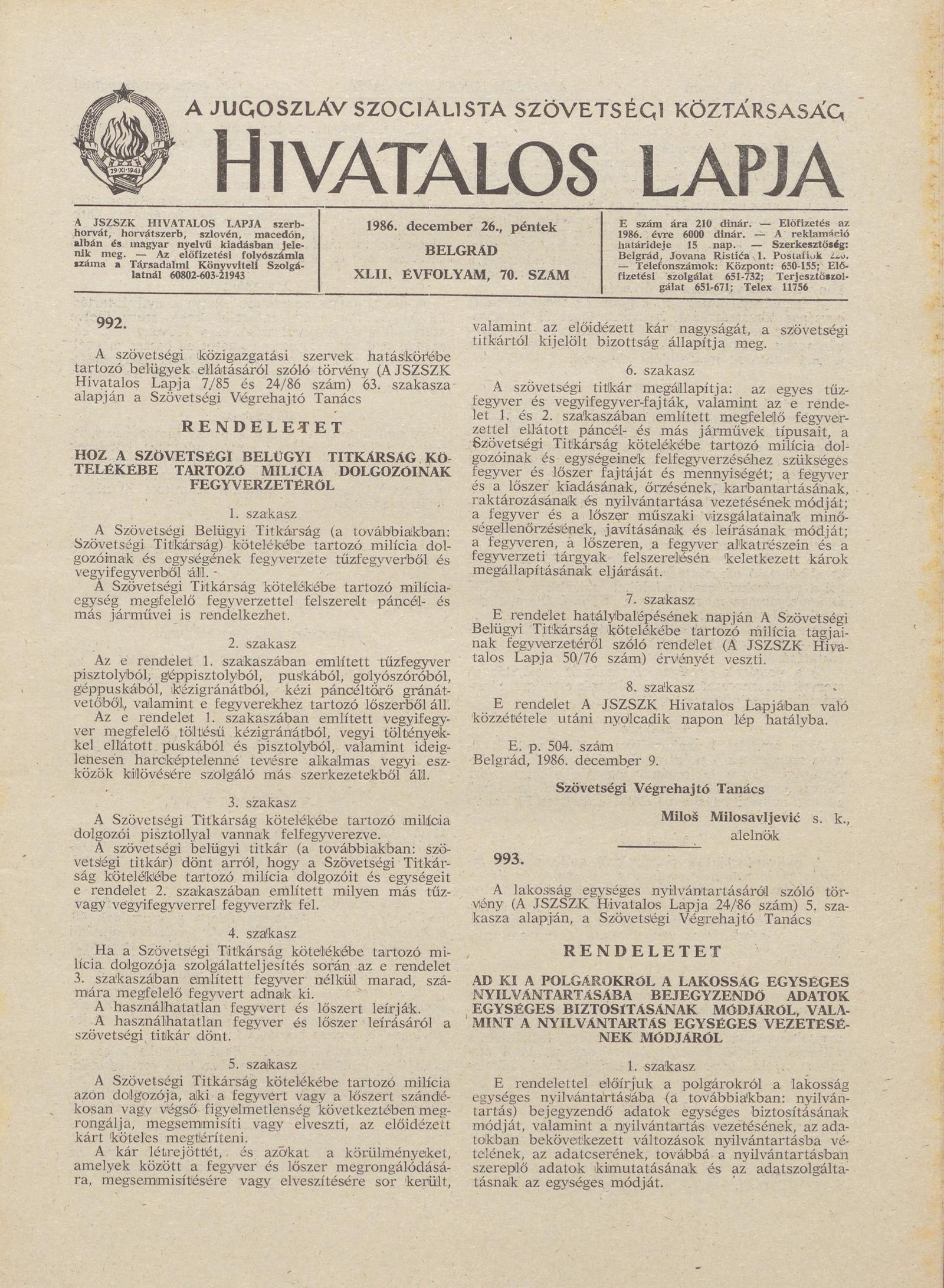 A Jugoszláv Szocialista Szövetségi Köztársaság Hivatalos Lapja, 42. évf. 1986. december 26. 70. sz. 2073–2096. oldal