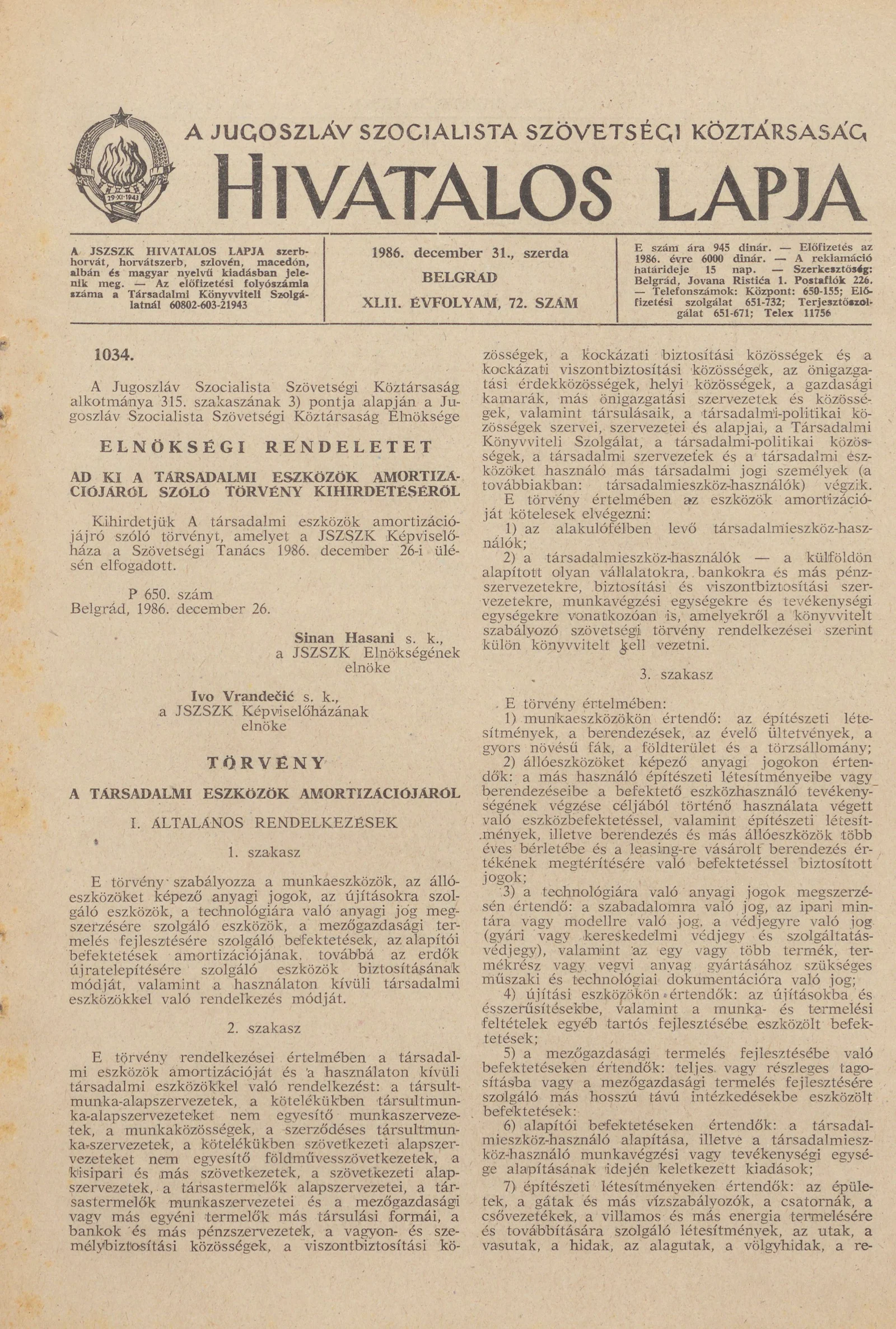 A Jugoszláv Szocialista Szövetségi Köztársaság Hivatalos Lapja, 42. évf. 1986. december 31. 72. sz. 2161–2268. oldal