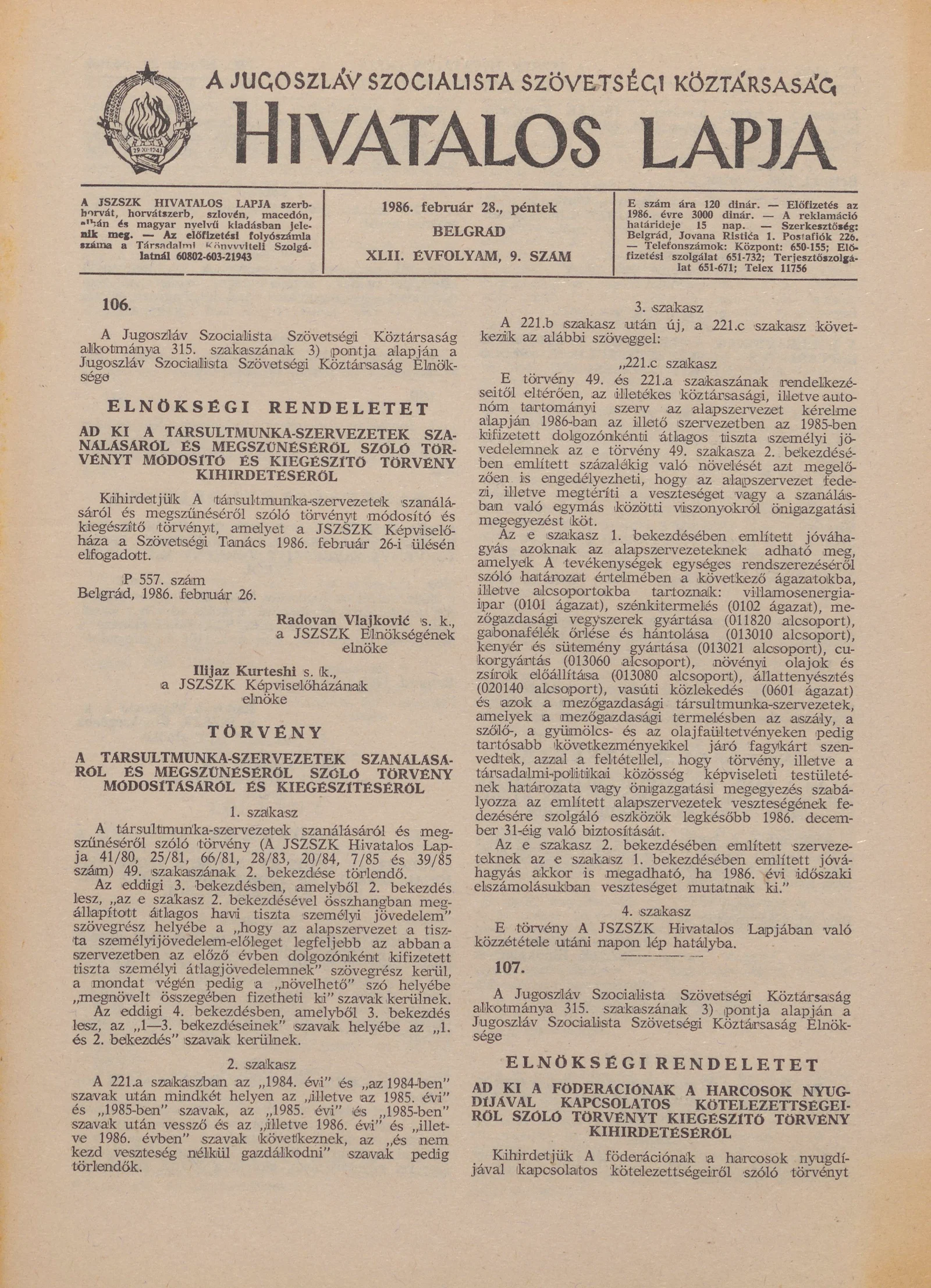 A Jugoszláv Szocialista Szövetségi Köztársaság Hivatalos Lapja, 42. évf. 1986. február 28. 9. sz. 201–264. oldal