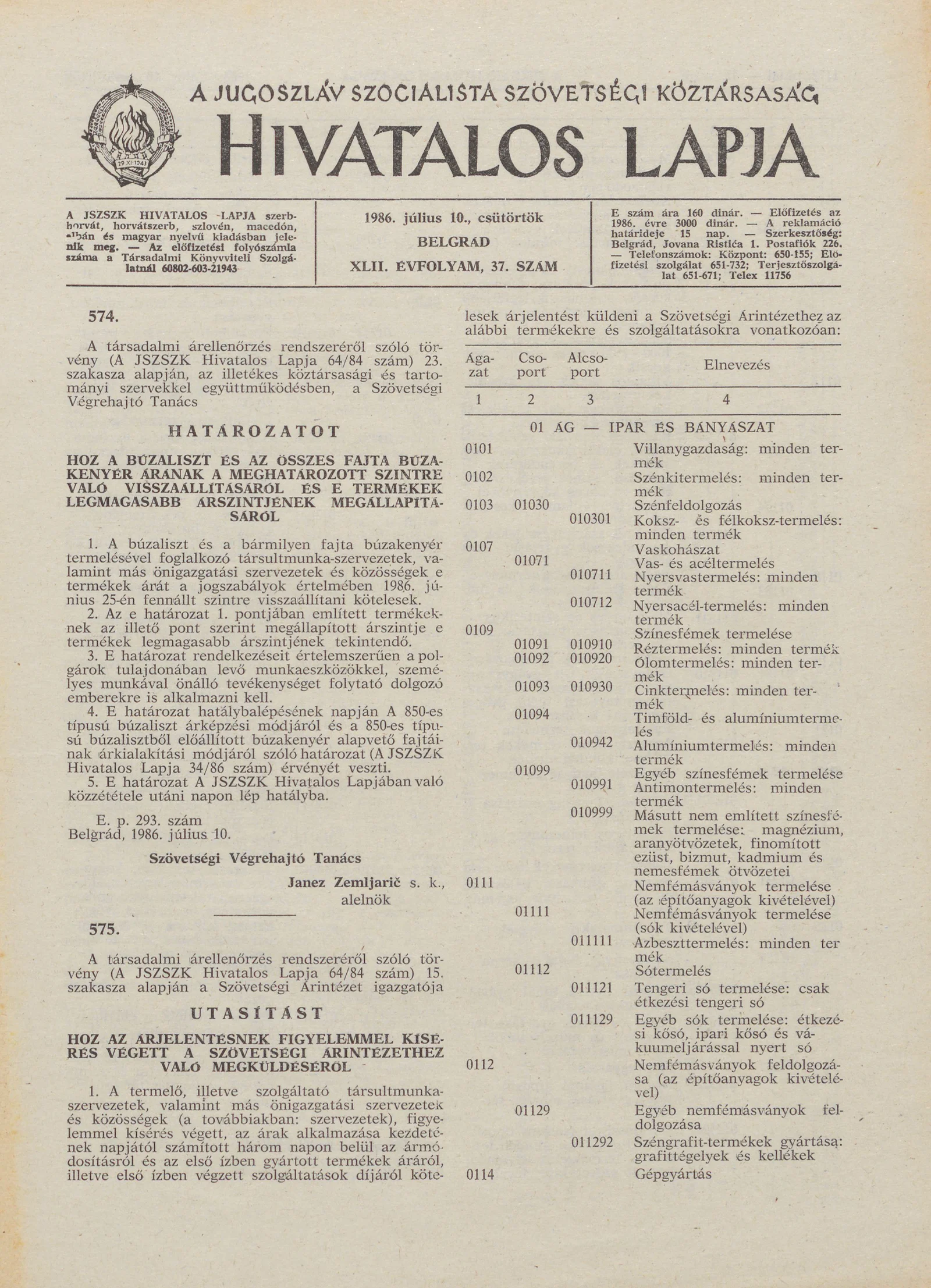 A Jugoszláv Szocialista Szövetségi Köztársaság Hivatalos Lapja, 42. évf. 1986. július 10. 37. sz. 1117–1120. oldal