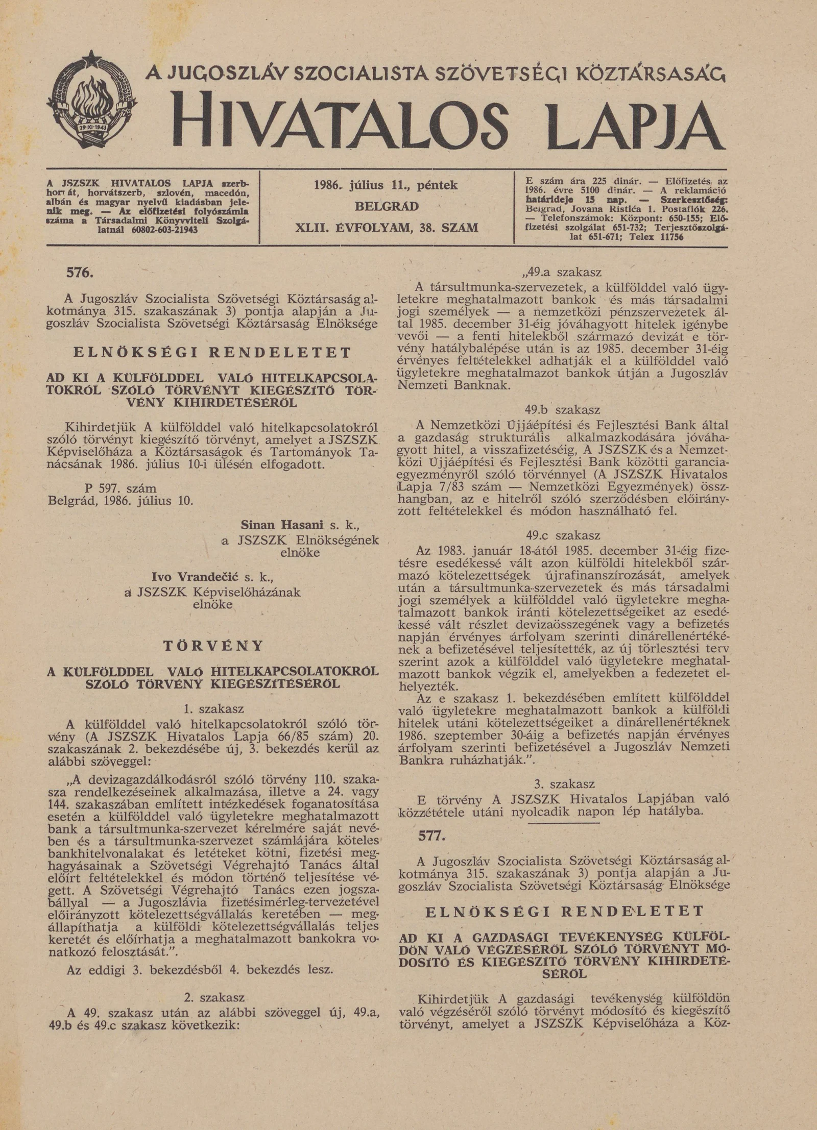 A Jugoszláv Szocialista Szövetségi Köztársaság Hivatalos Lapja, 42. évf. 1986. július 11. 38. sz. 1121–1156. oldal