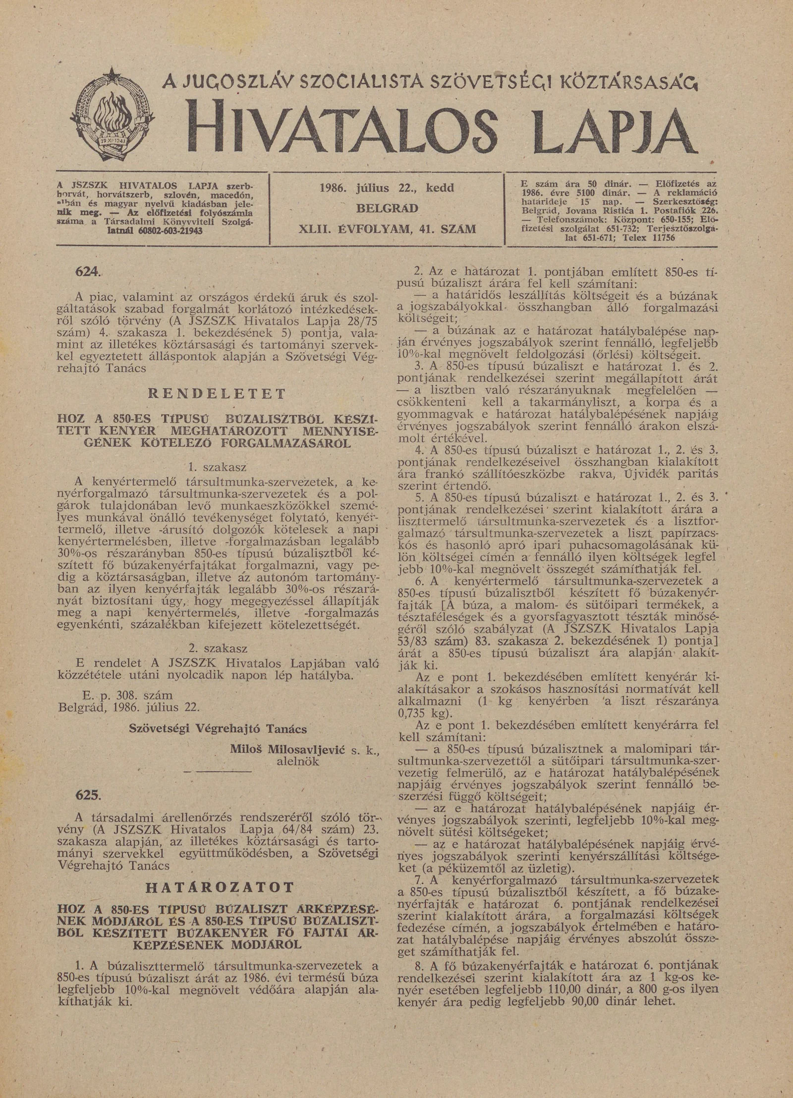 A Jugoszláv Szocialista Szövetségi Köztársaság Hivatalos Lapja, 42. évf. 1986. július 22. 41. sz. 1237–1244. oldal
