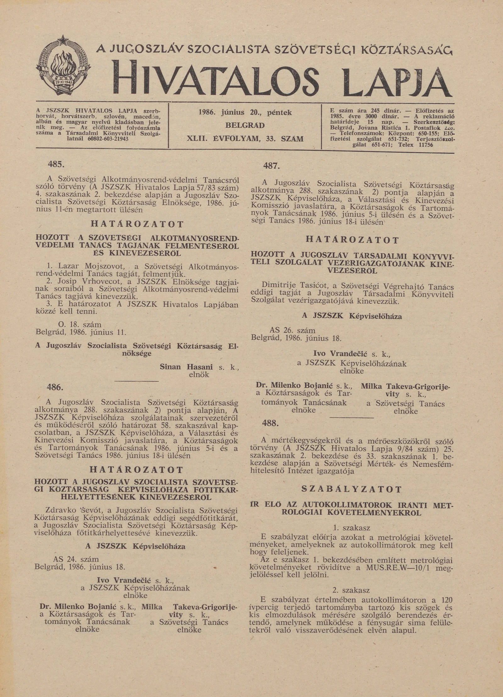 A Jugoszláv Szocialista Szövetségi Köztársaság Hivatalos Lapja, 42. évf. 1986. június 20. 33. sz. 1005–1032. oldal