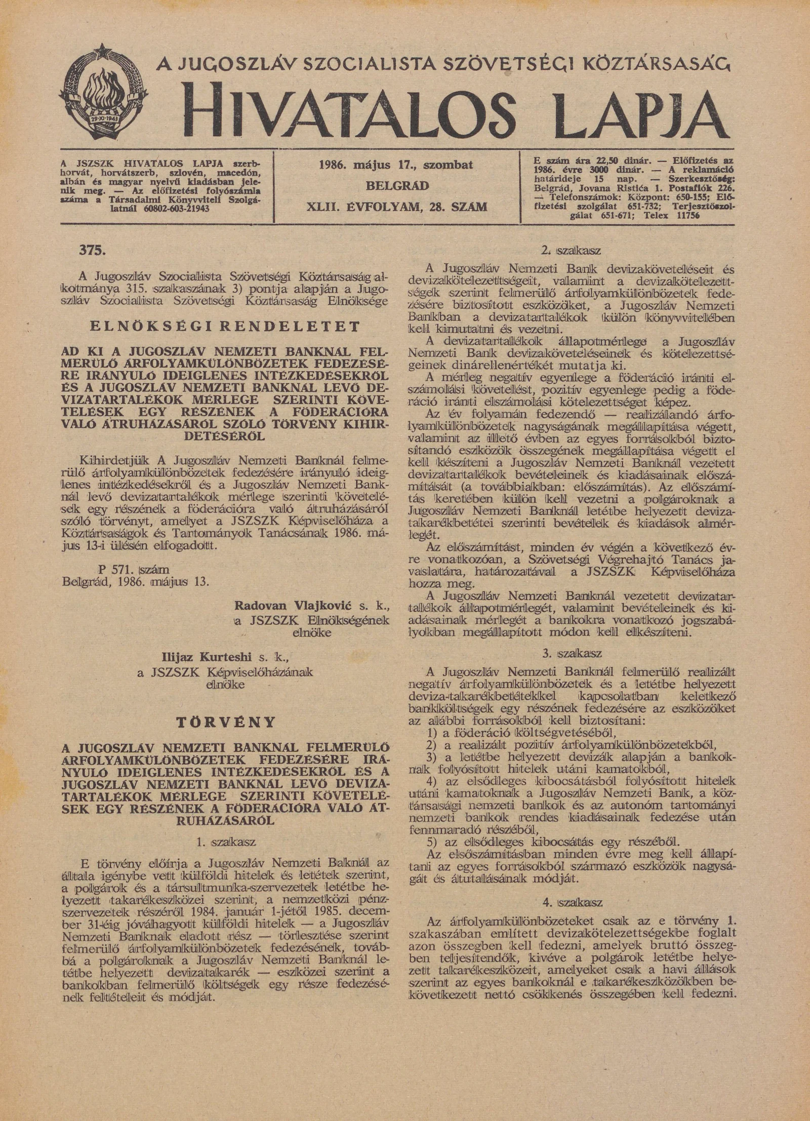 A Jugoszláv Szocialista Szövetségi Köztársaság Hivatalos Lapja, 42. évf. 1986. május 17. 28. sz. 861–872. oldal