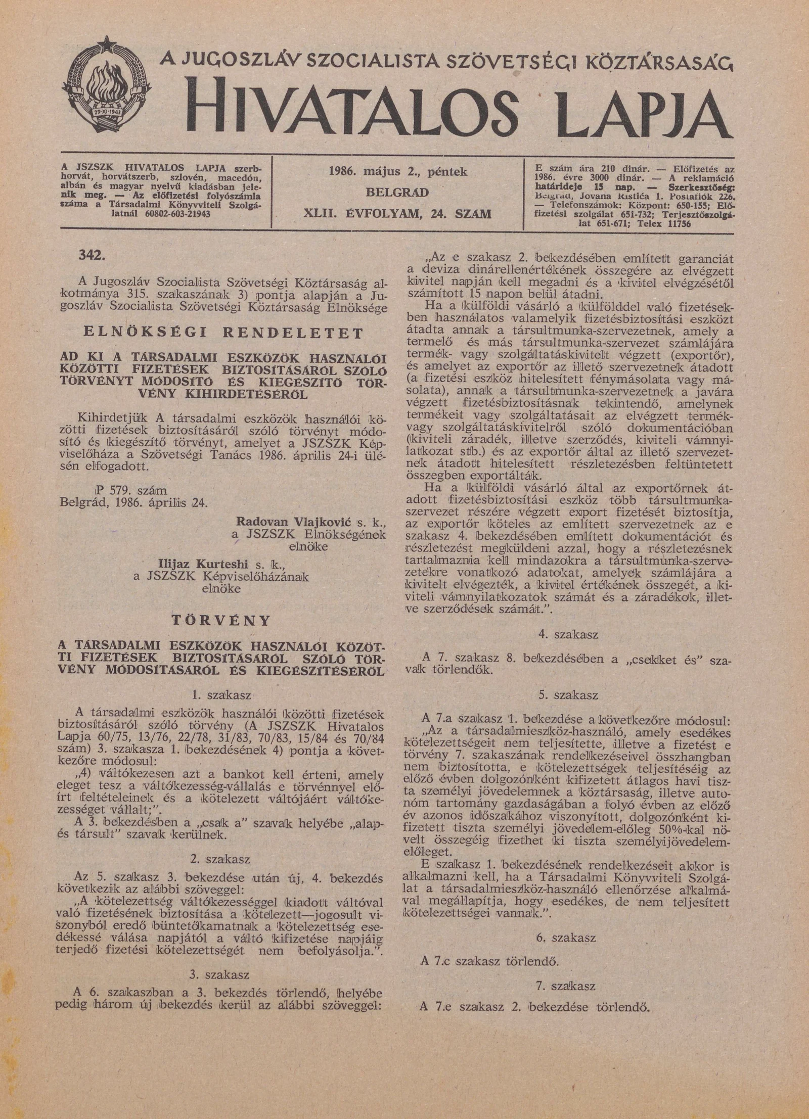 A Jugoszláv Szocialista Szövetségi Köztársaság Hivatalos Lapja, 42. évf. 1986. május 2. 24. sz. 749–772. oldal