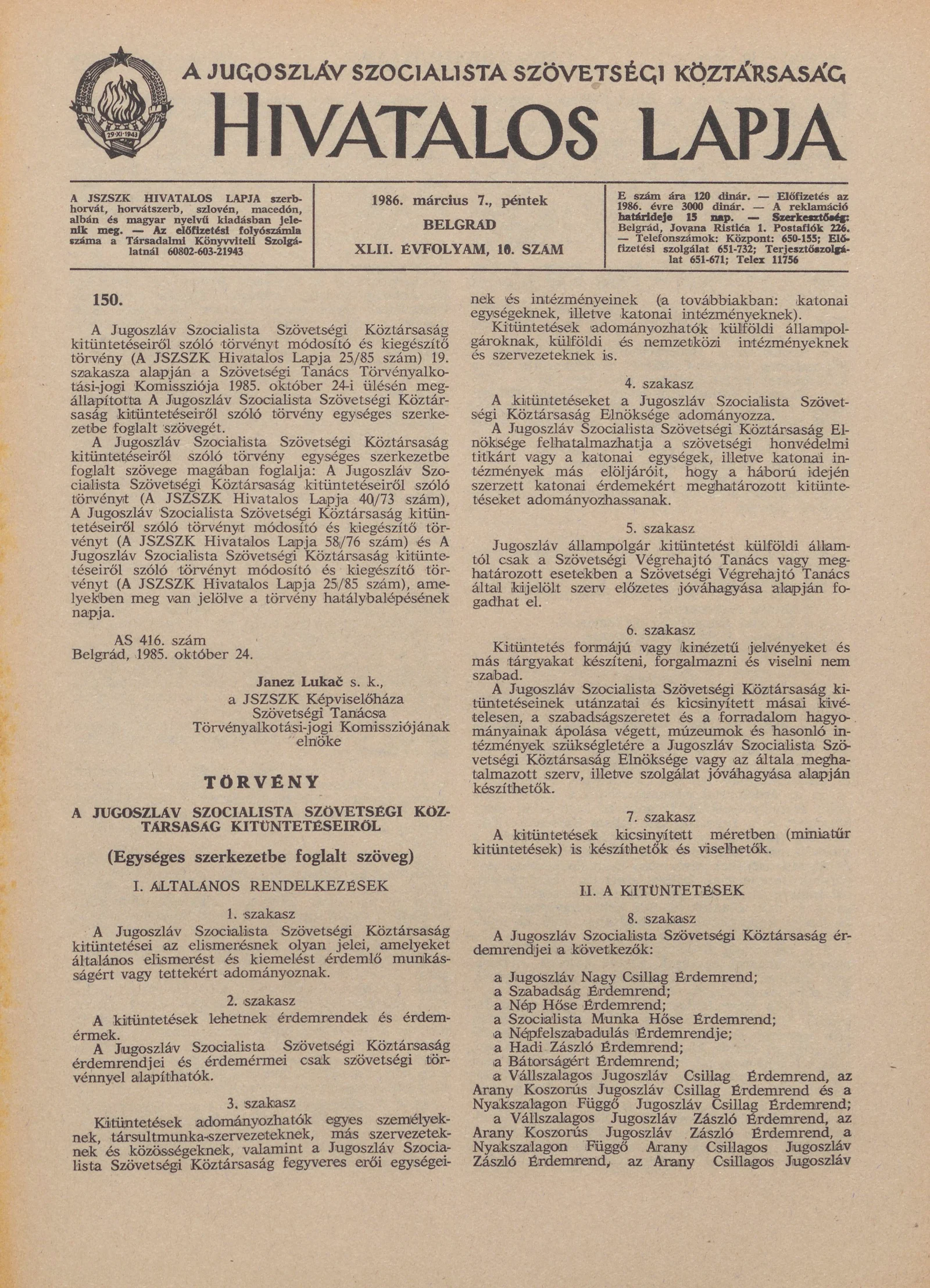 A Jugoszláv Szocialista Szövetségi Köztársaság Hivatalos Lapja, 42. évf. 1986. március 7. 10. sz. 265–327. oldal