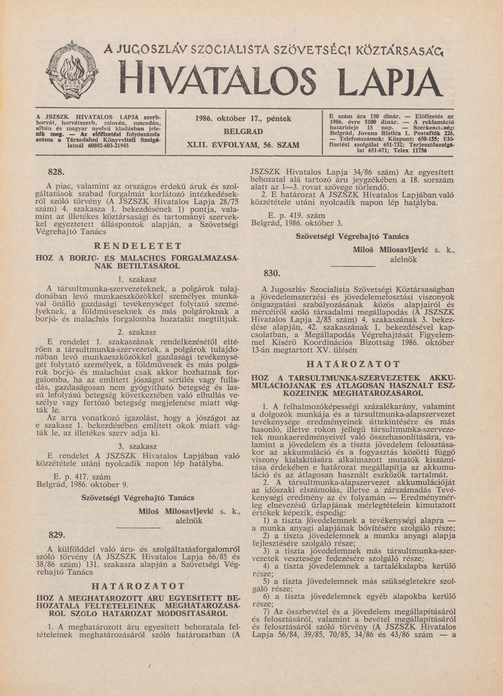 A Jugoszláv Szocialista Szövetségi Köztársaság Hivatalos Lapja, 42. évf. 1986. október 17. 56. sz. 1649–1668. oldal