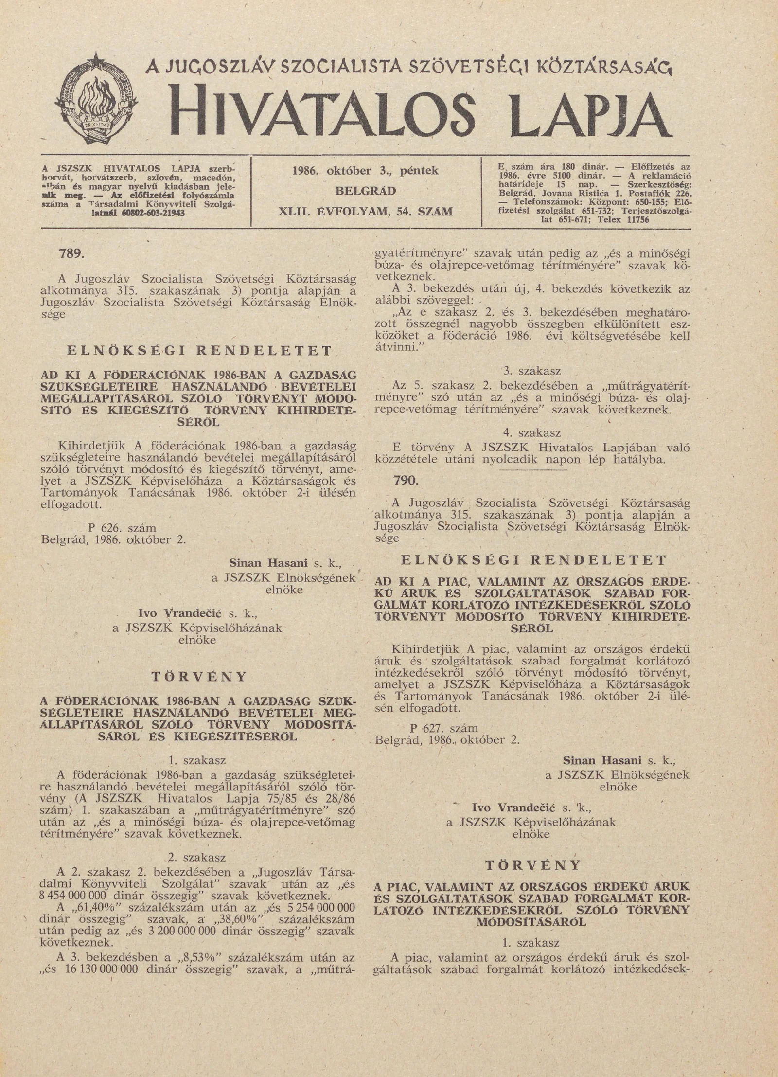 A Jugoszláv Szocialista Szövetségi Köztársaság Hivatalos Lapja, 42. évf. 1986. október 3. 54. sz. 1617–1640. oldal