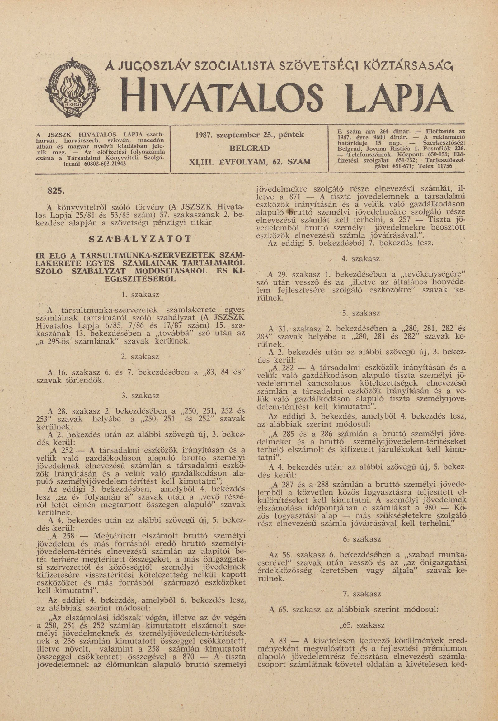 A Jugoszláv Szocialista Szövetségi Köztársaság Hivatalos Lapja, 43. évf. 1987. szeptember 25. 62. sz. 1473–1496. oldal
