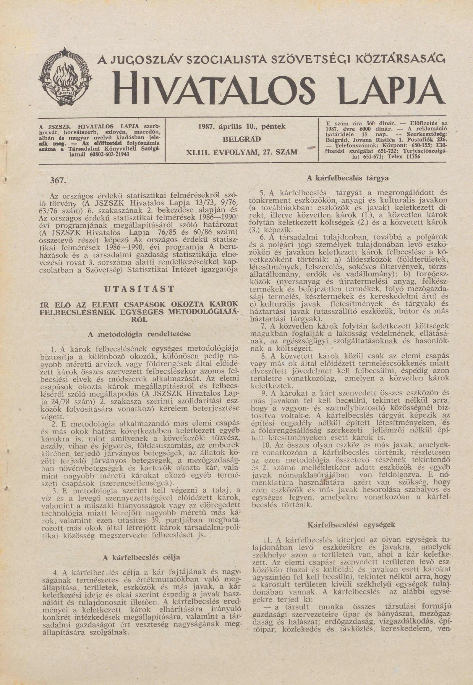 A Jugoszláv Szocialista Szövetségi Köztársaság Hivatalos Lapja, 43. évf. 1987. április 10. 27. sz. 653–716. oldal