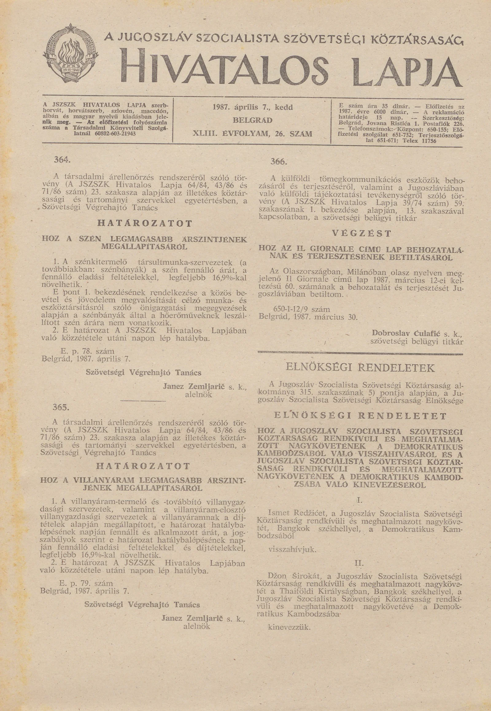 A Jugoszláv Szocialista Szövetségi Köztársaság Hivatalos Lapja, 43. évf. 1987. április 7. 26. sz. 649–652. oldal