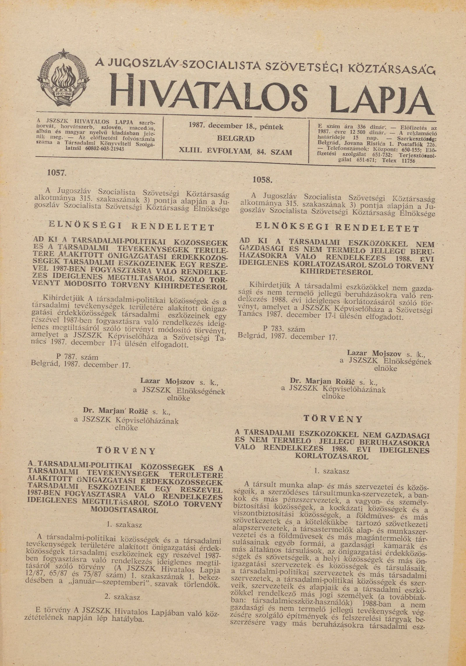 - Törvény A társadalmi-politikai közösségek és a társadalmi tevékenységek területére alakított önigazgatási érdekközösségek társadalmi eszközeinek egy részével 1987-ben fogyasztásra való rendelkezés ideiglenes megtiltásáról szóló törvény módosításáról2273