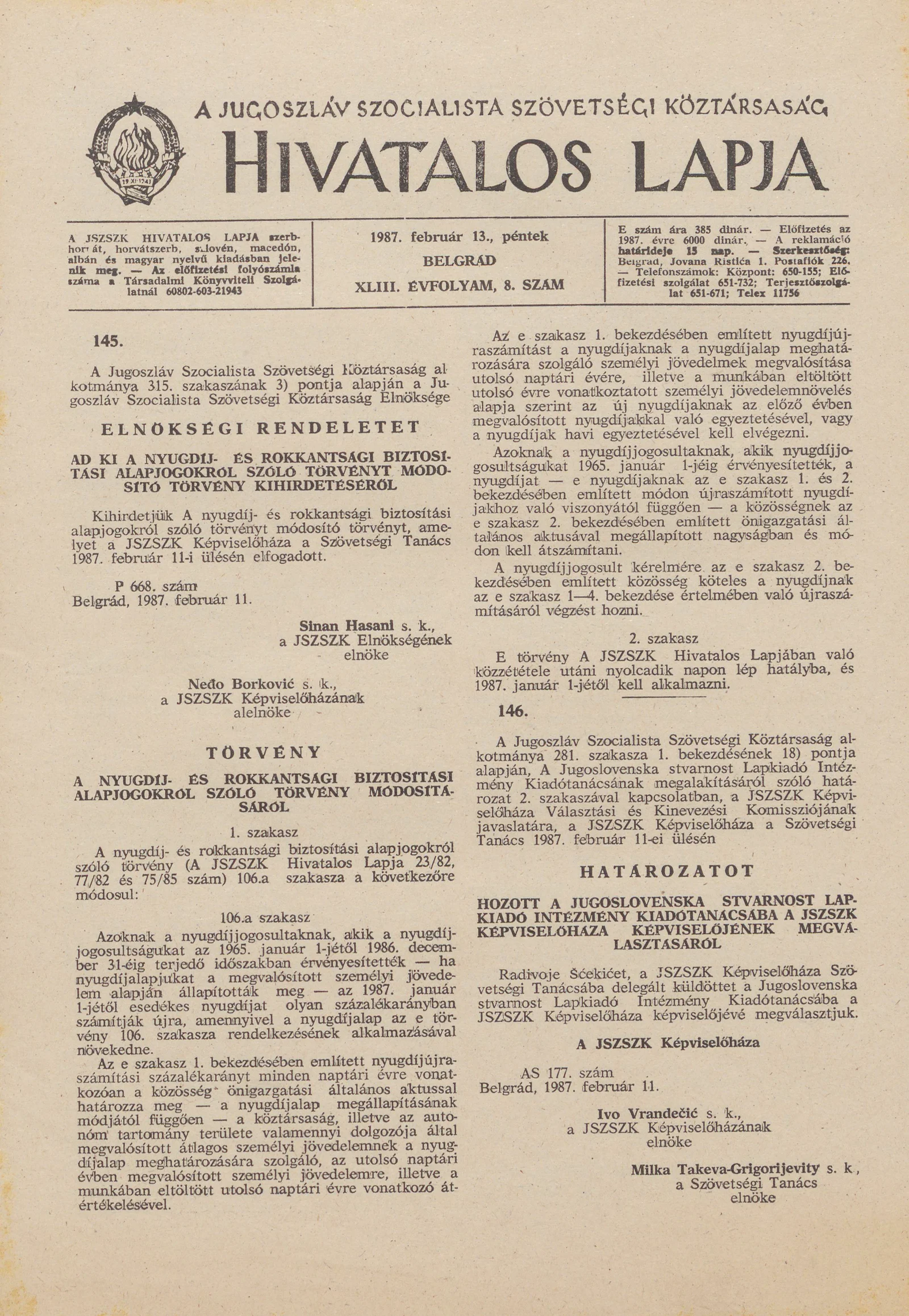 - Határozat a Jugoslovenska stvarnost Lapkiadó Intézmény Kiadótanácsába a JSZSZK Képviselőháza képviselőjének megválasztásáról225
