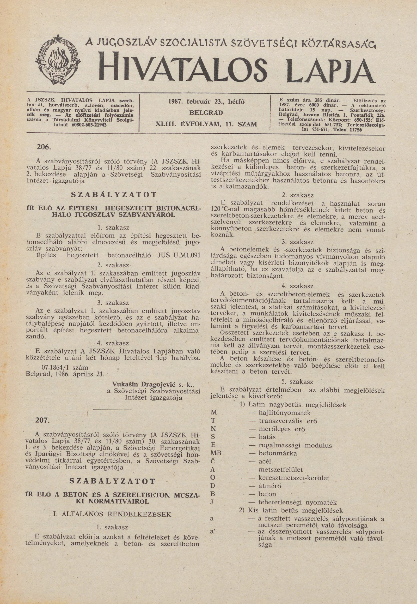 A Jugoszláv Szocialista Szövetségi Köztársaság Hivatalos Lapja, 43. évf. 1987. február 23. 11. sz. 309–352. oldal