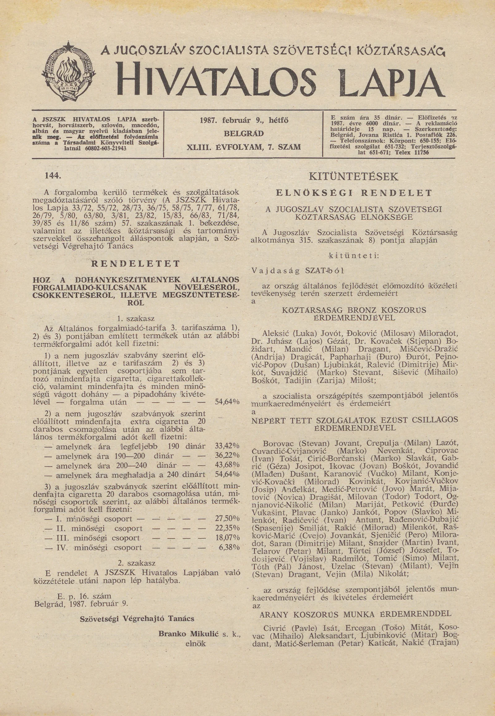 A Jugoszláv Szocialista Szövetségi Köztársaság Hivatalos Lapja, 43. évf. 1987. február 9. 7. sz. 221–224. oldal
