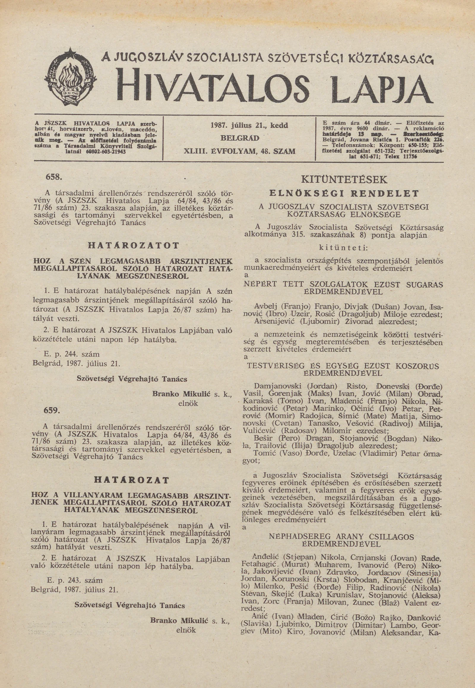 A Jugoszláv Szocialista Szövetségi Köztársaság Hivatalos Lapja, 43. évf. 1987. július 21. 48. sz. 1201–1204. oldal