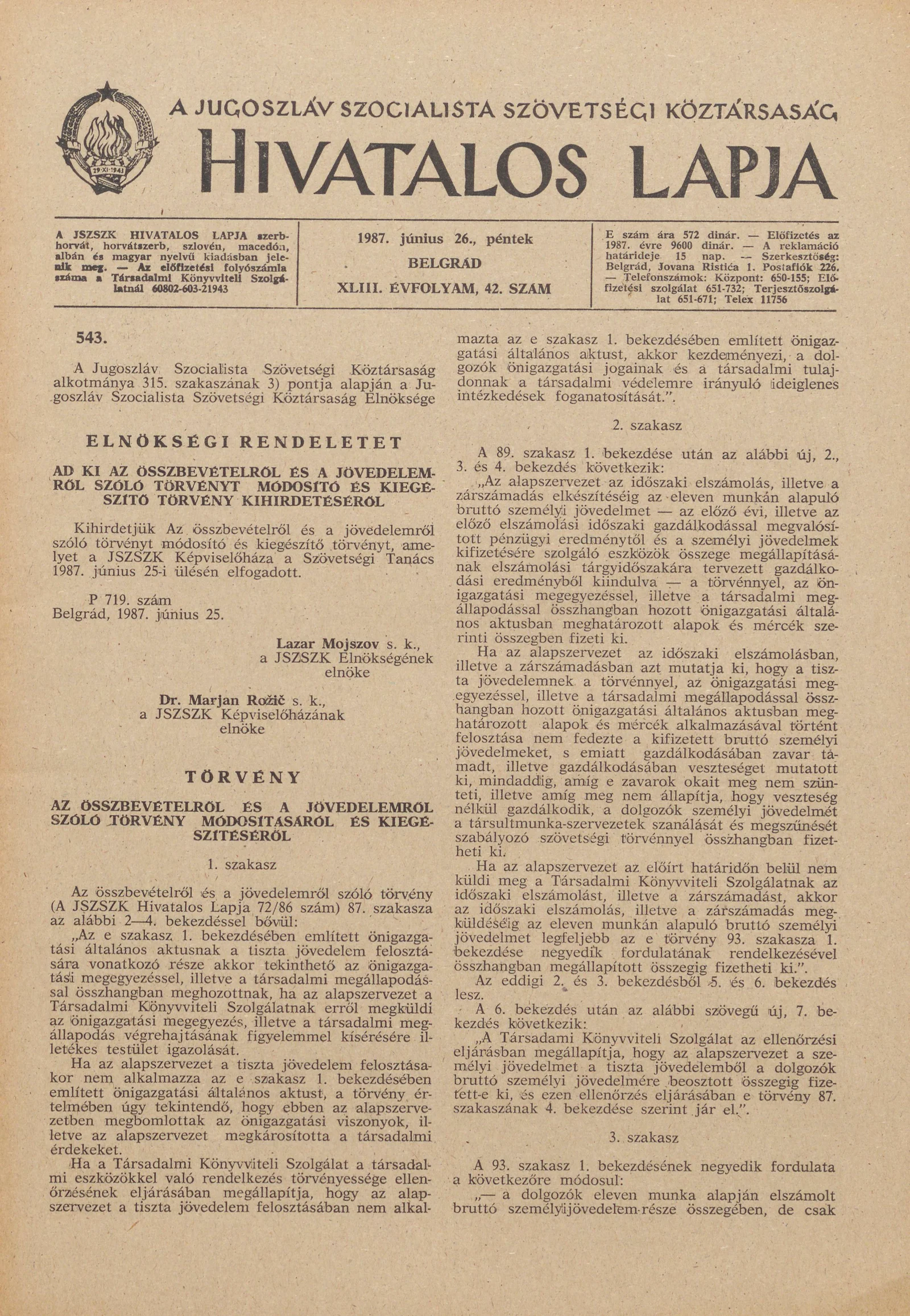 A Jugoszláv Szocialista Szövetségi Köztársaság Hivatalos Lapja, 43. évf. 1987. június 26. 42. sz. 1033–1084. oldal