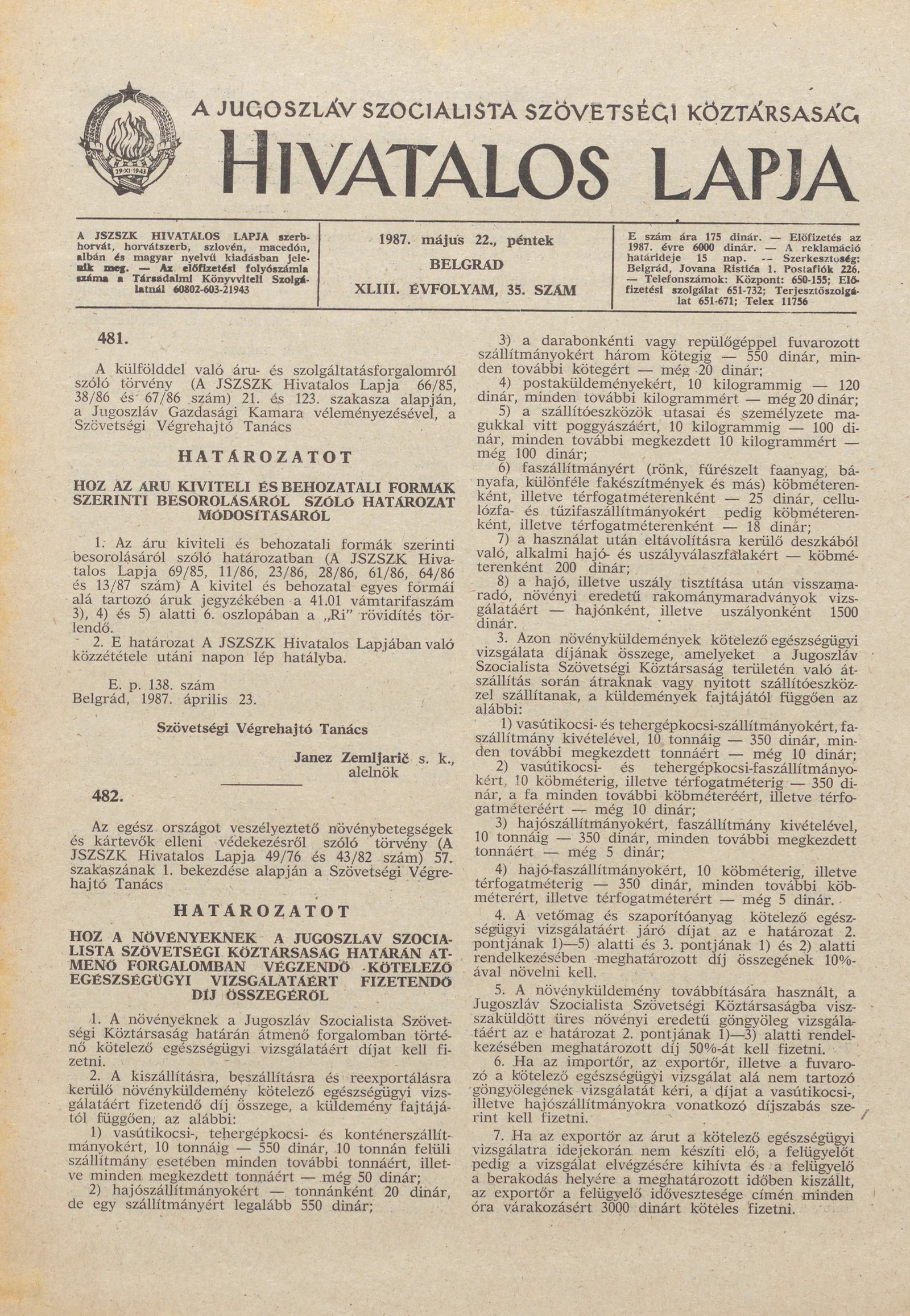- Határozat a növényeknek a Jugoszláv Szocialista Szövetségi Köztársaság határán átmenő forgalomban végzendő kötelező egészségügyi vizsgálatáért fizetendő díj összegéről885