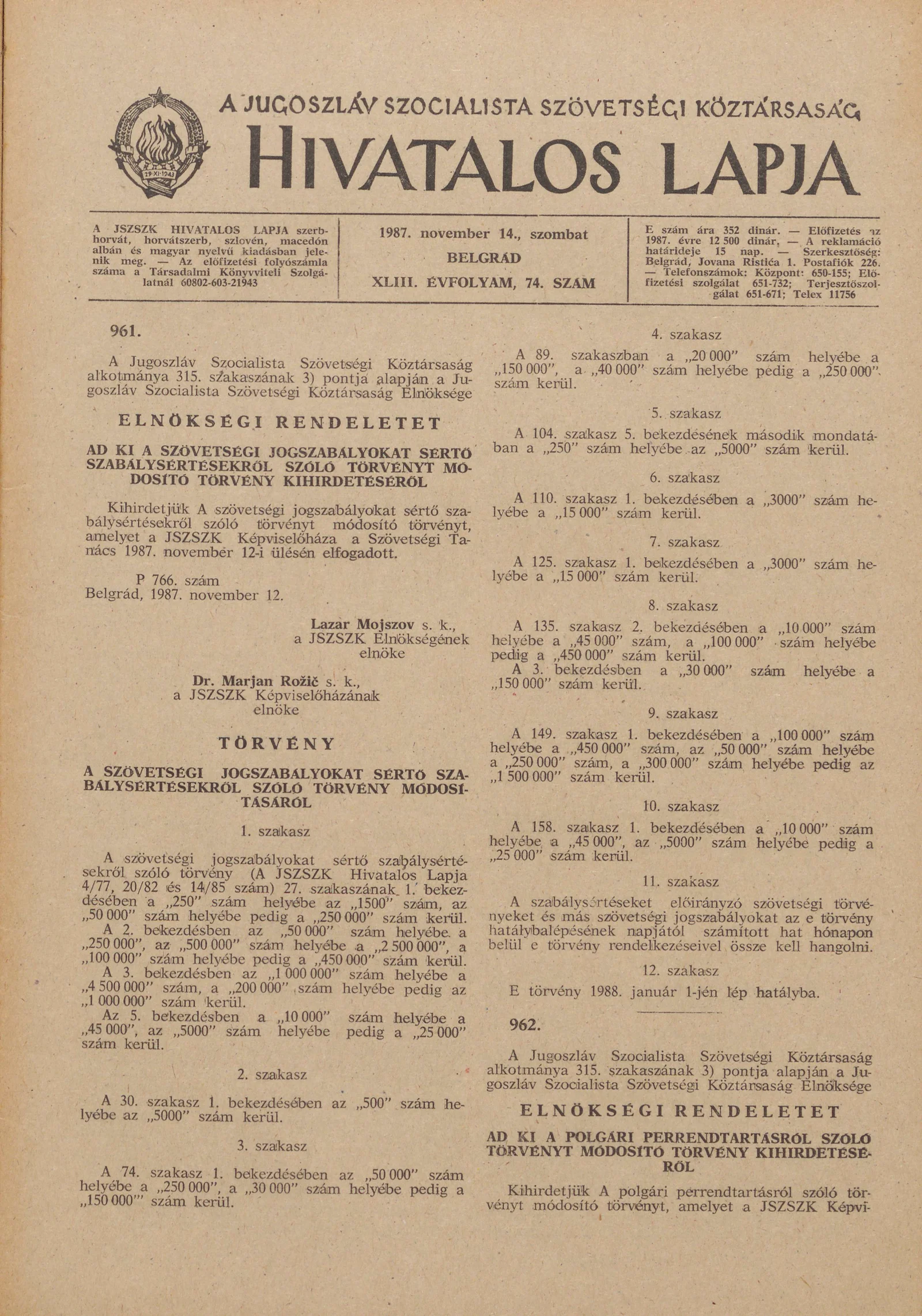 A Jugoszláv Szocialista Szövetségi Köztársaság Hivatalos Lapja, 43. évf. 1987. november 14. 74. sz. 1741–1772. oldal