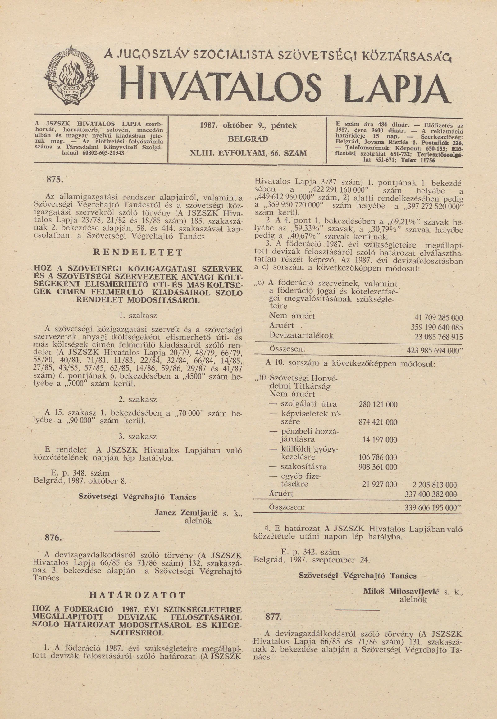A Jugoszláv Szocialista Szövetségi Köztársaság Hivatalos Lapja, 43. évf. 1987. október 9. 66. sz. 1541–1584. oldal