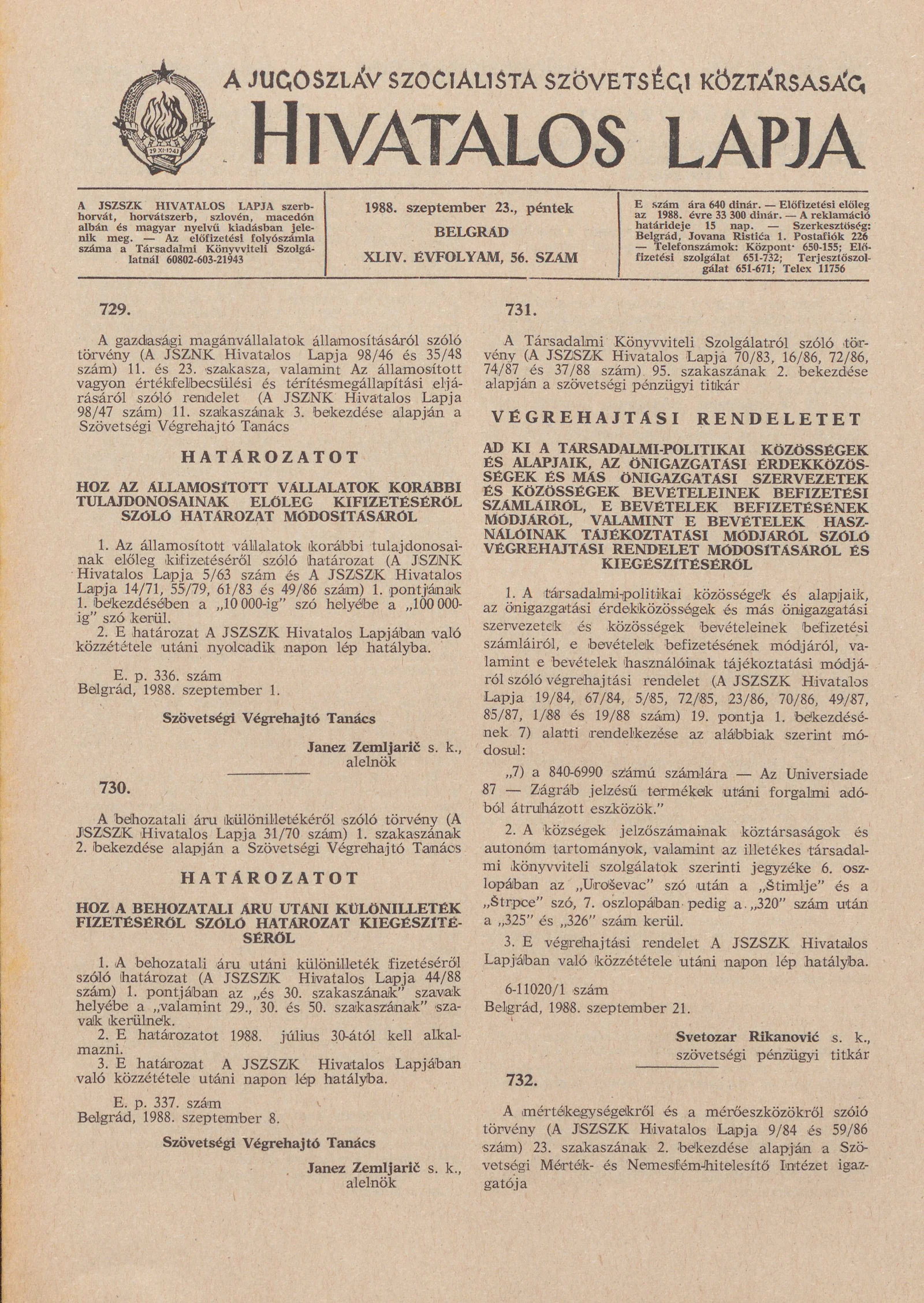 A Jugoszláv Szocialista Szövetségi Köztársaság Hivatalos Lapja, 44. évf. 1988. szeptember 23. 56. sz. 1489–1504. oldal