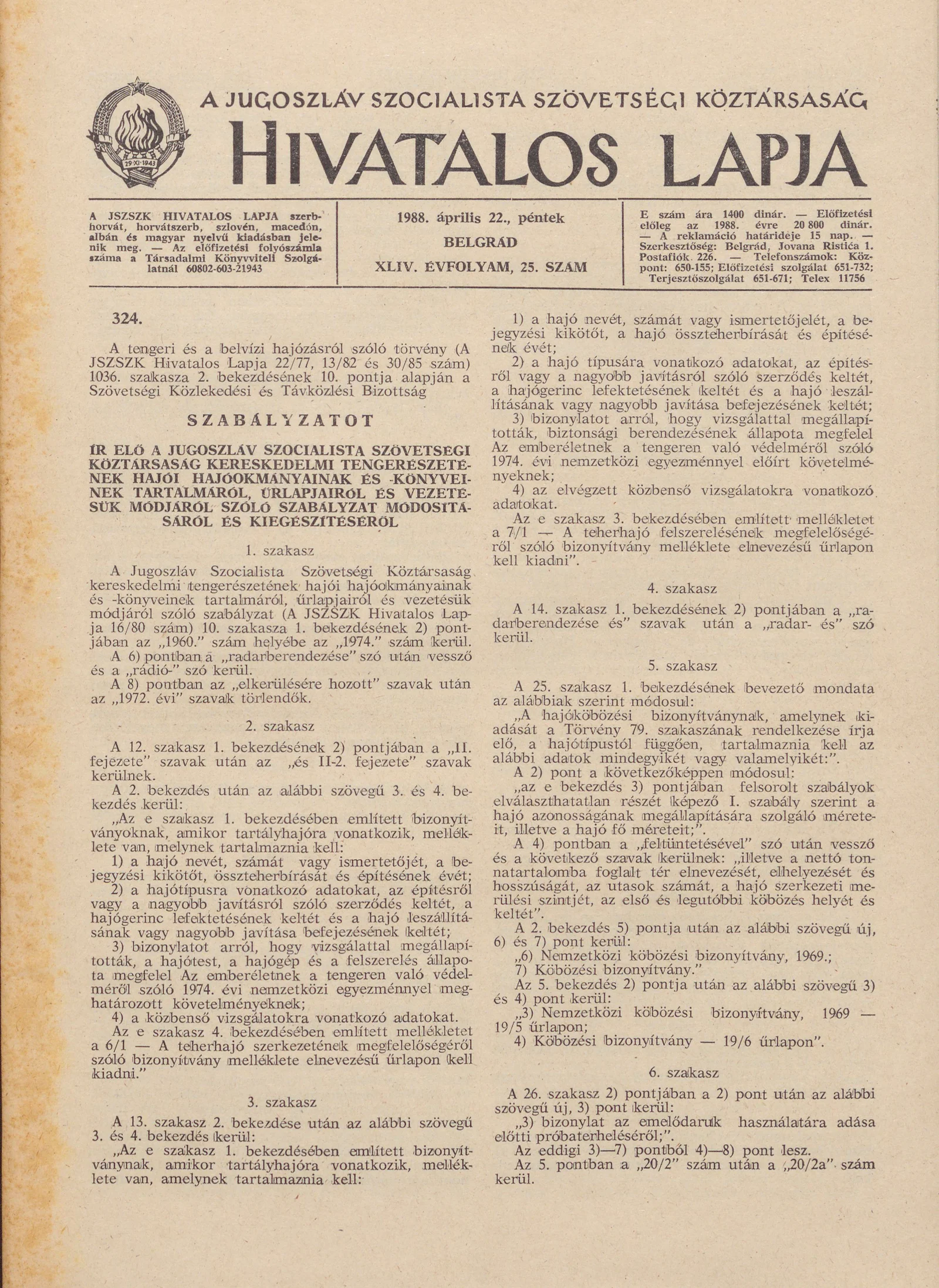 A Jugoszláv Szocialista Szövetségi Köztársaság Hivatalos Lapja, 44. évf. 1988. április 22. 25. sz. 677–732. oldal