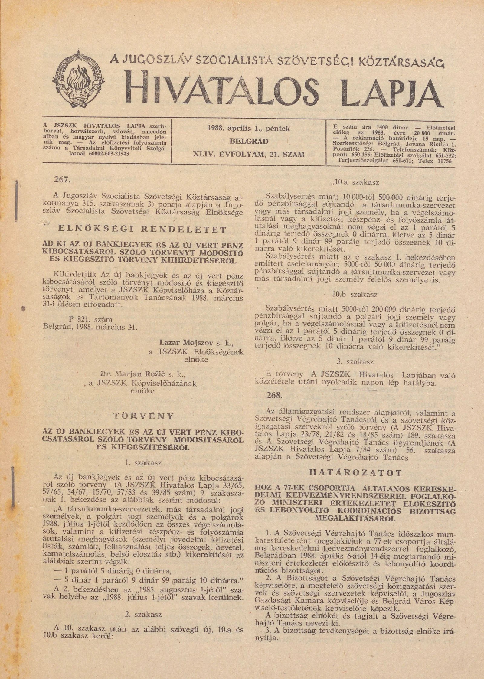 A Jugoszláv Szocialista Szövetségi Köztársaság Hivatalos Lapja, 44. évf. 1988. április 1. 21. sz. 569–624. oldal
