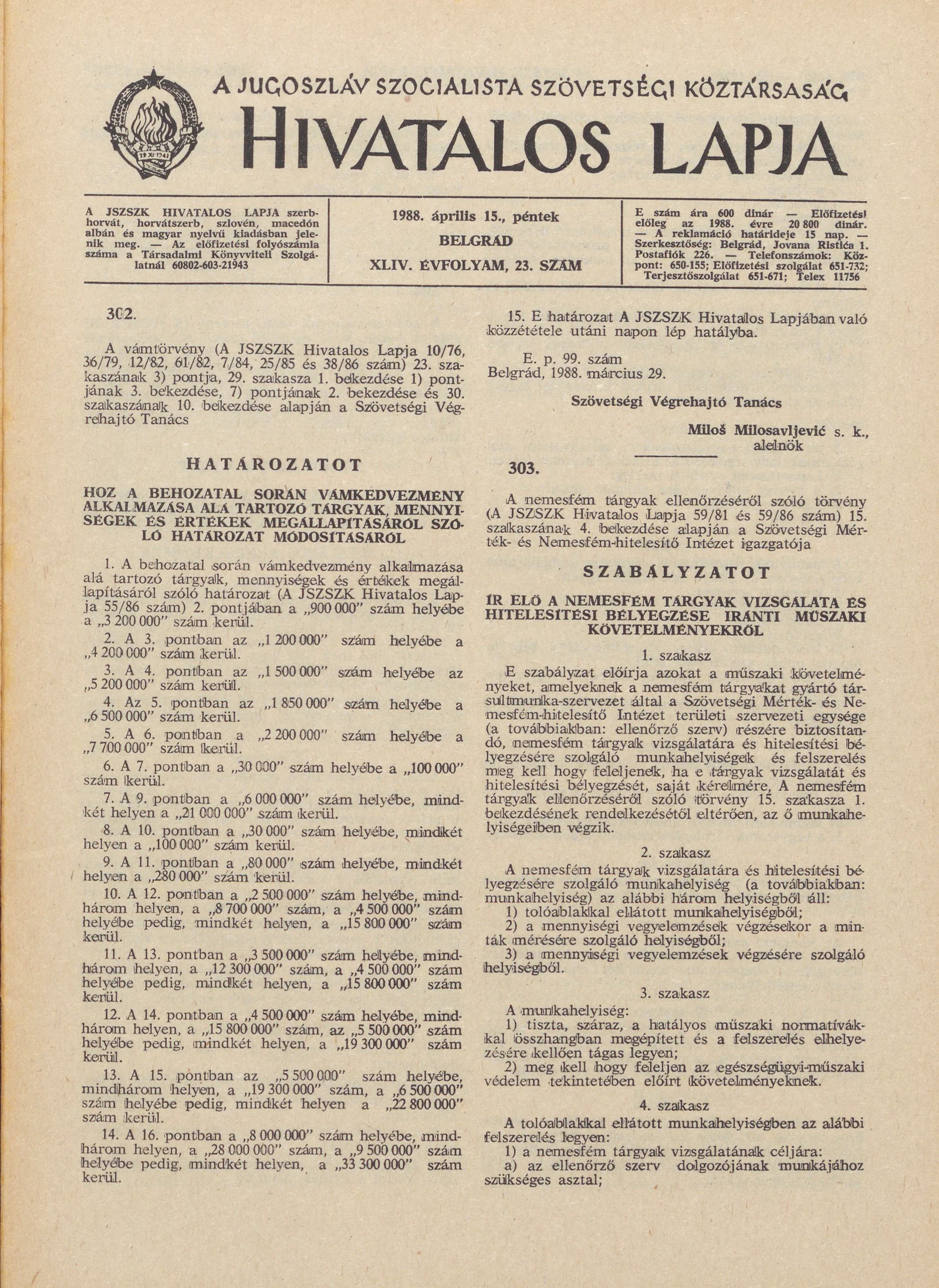 A Jugoszláv Szocialista Szövetségi Köztársaság Hivatalos Lapja, 44. évf. 1988. április 15. 23. sz. 633–656. oldal
