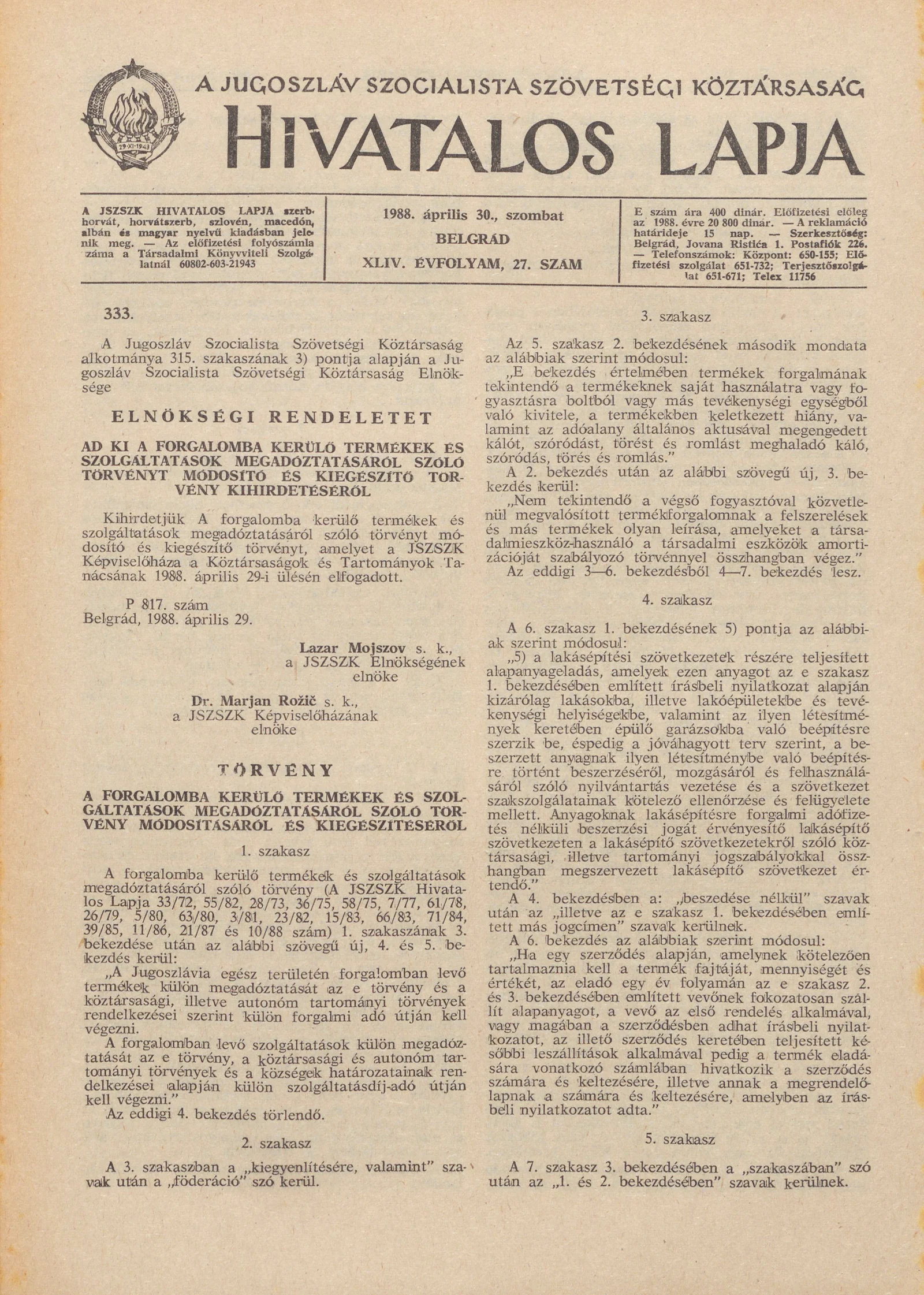 A Jugoszláv Szocialista Szövetségi Köztársaság Hivatalos Lapja, 44. évf. 1988. április 30. 27. sz. 773–788. oldal