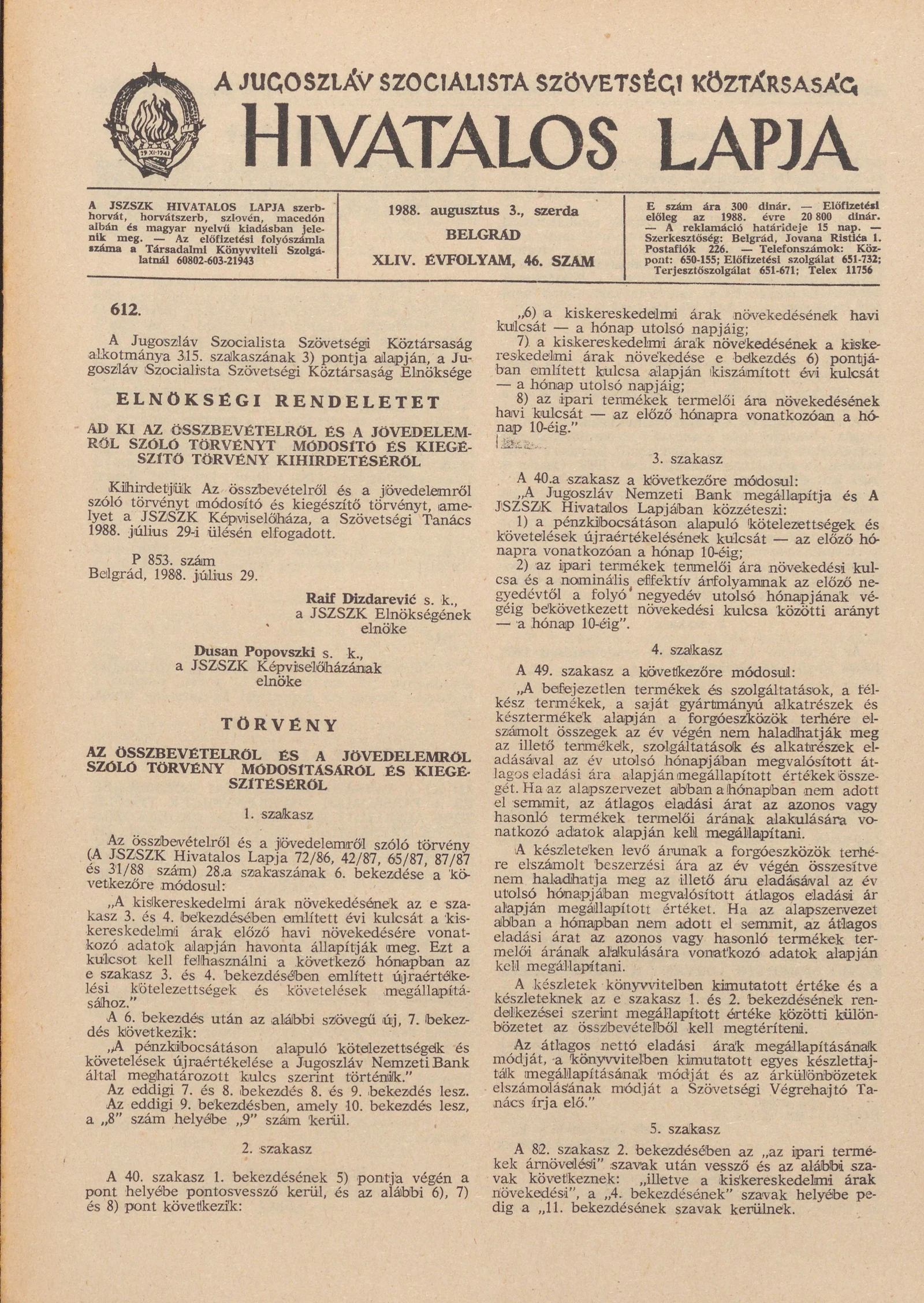 A Jugoszláv Szocialista Szövetségi Köztársaság Hivatalos Lapja, 44. évf. 1988. augusztus 3. 46. sz. 1293–1304. oldal