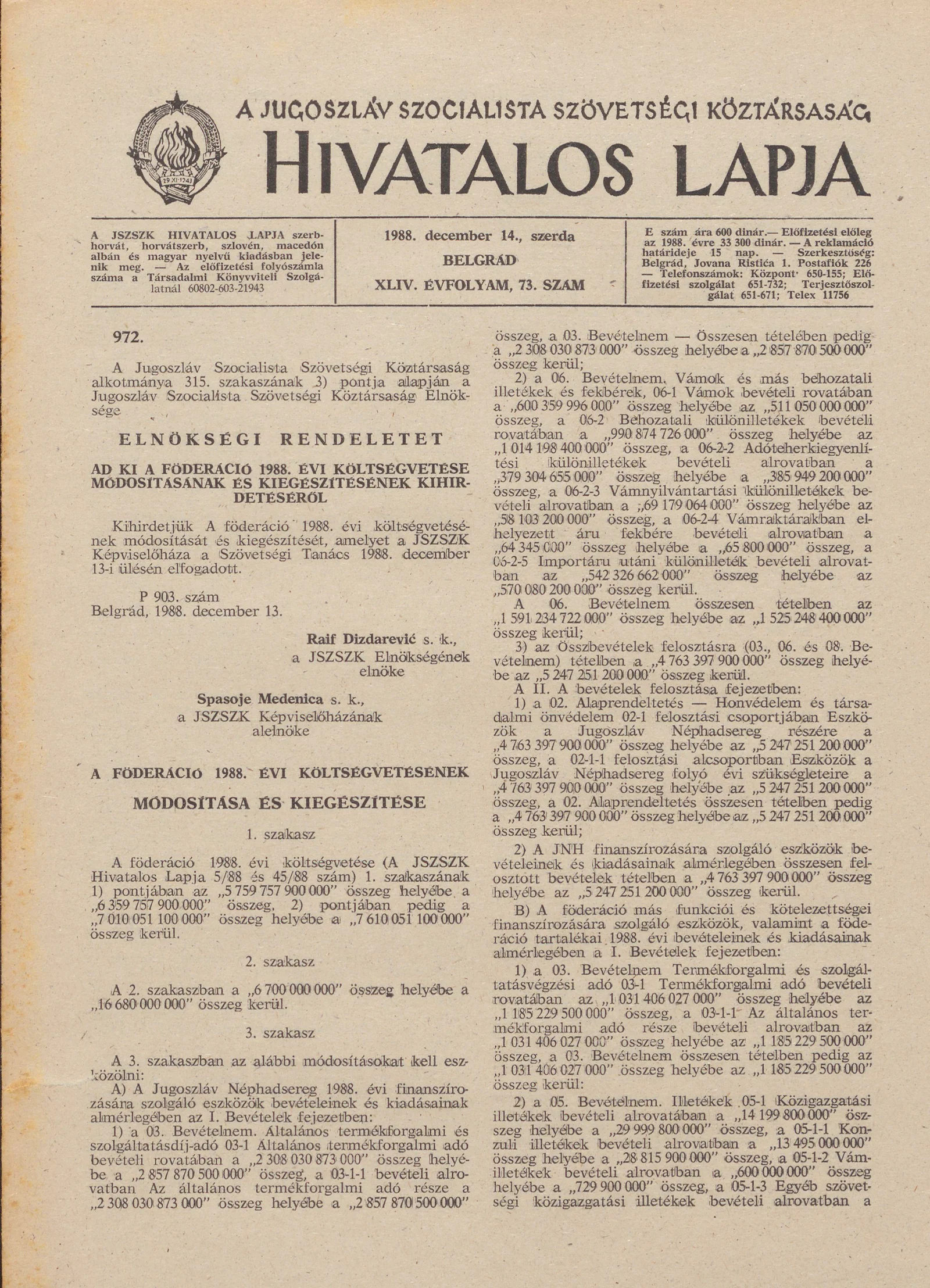 A Jugoszláv Szocialista Szövetségi Köztársaság Hivatalos Lapja, 44. évf. 1988. december 14. 73. sz. 1849–1852. oldal