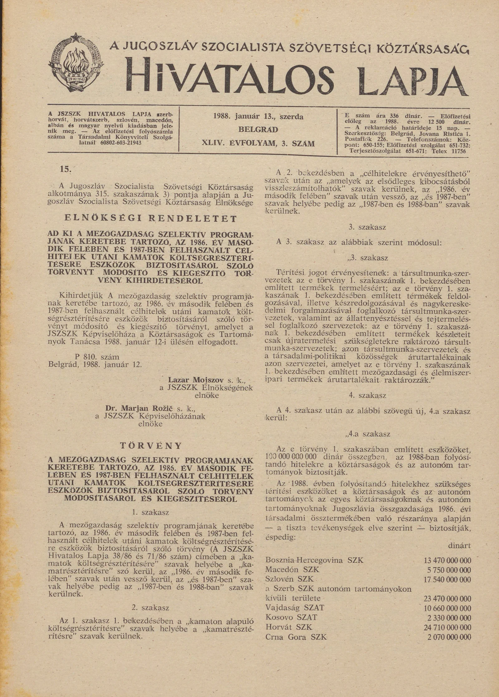 A Jugoszláv Szocialista Szövetségi Köztársaság Hivatalos Lapja, 44. évf. 1988. január 13. 3. sz. 61–84. oldal