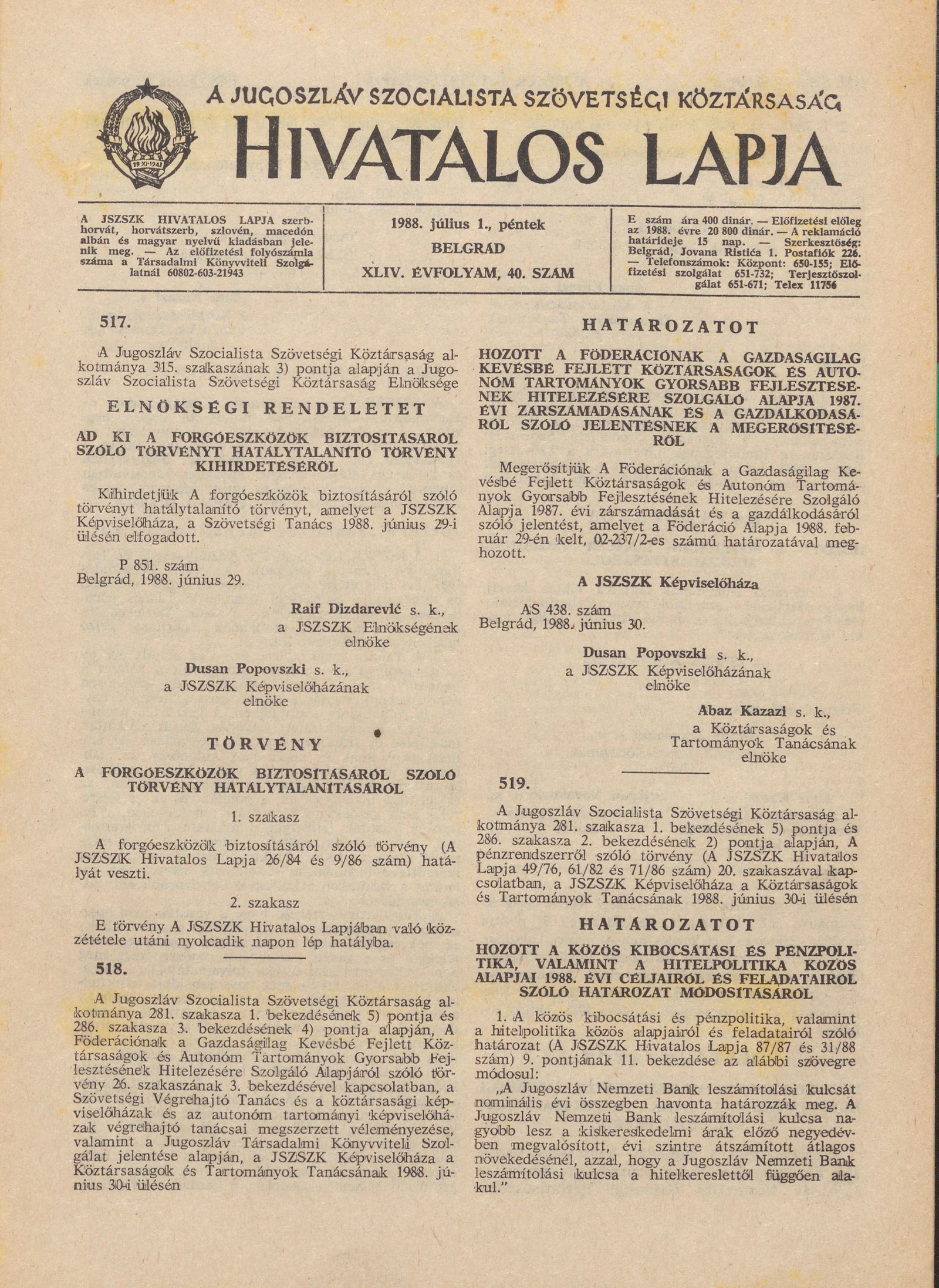 - Határozat A Föderációnak a Gazdaságilag Kevésbé Fejlett Köztársaságok és Autonóm Tartományok Gyorsabb Fejlesztésére Szolgáló Hitelezési Alapja 1987. évi zárszámadásának és a gazdálkodásról szóló jelentésnek a megerősítéséről1123