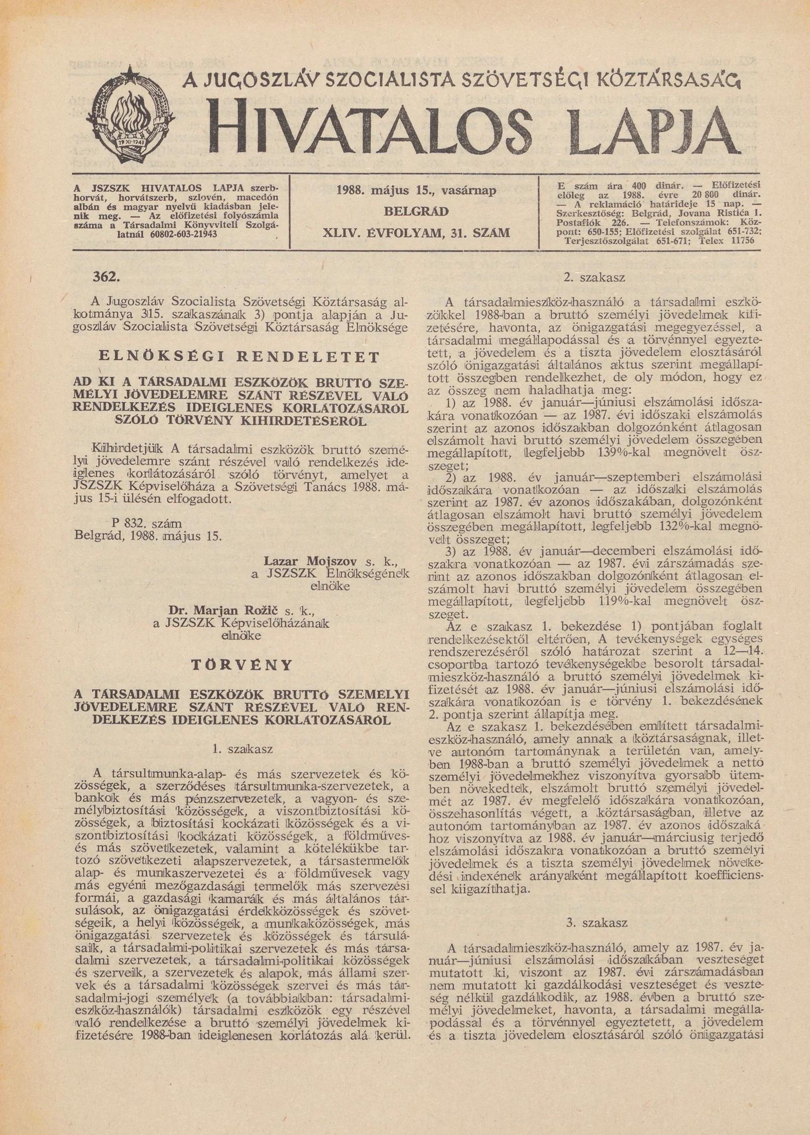 A Jugoszláv Szocialista Szövetségi Köztársaság Hivatalos Lapja, 44. évf. 1988. május 15. 31. sz. 821–836. oldal