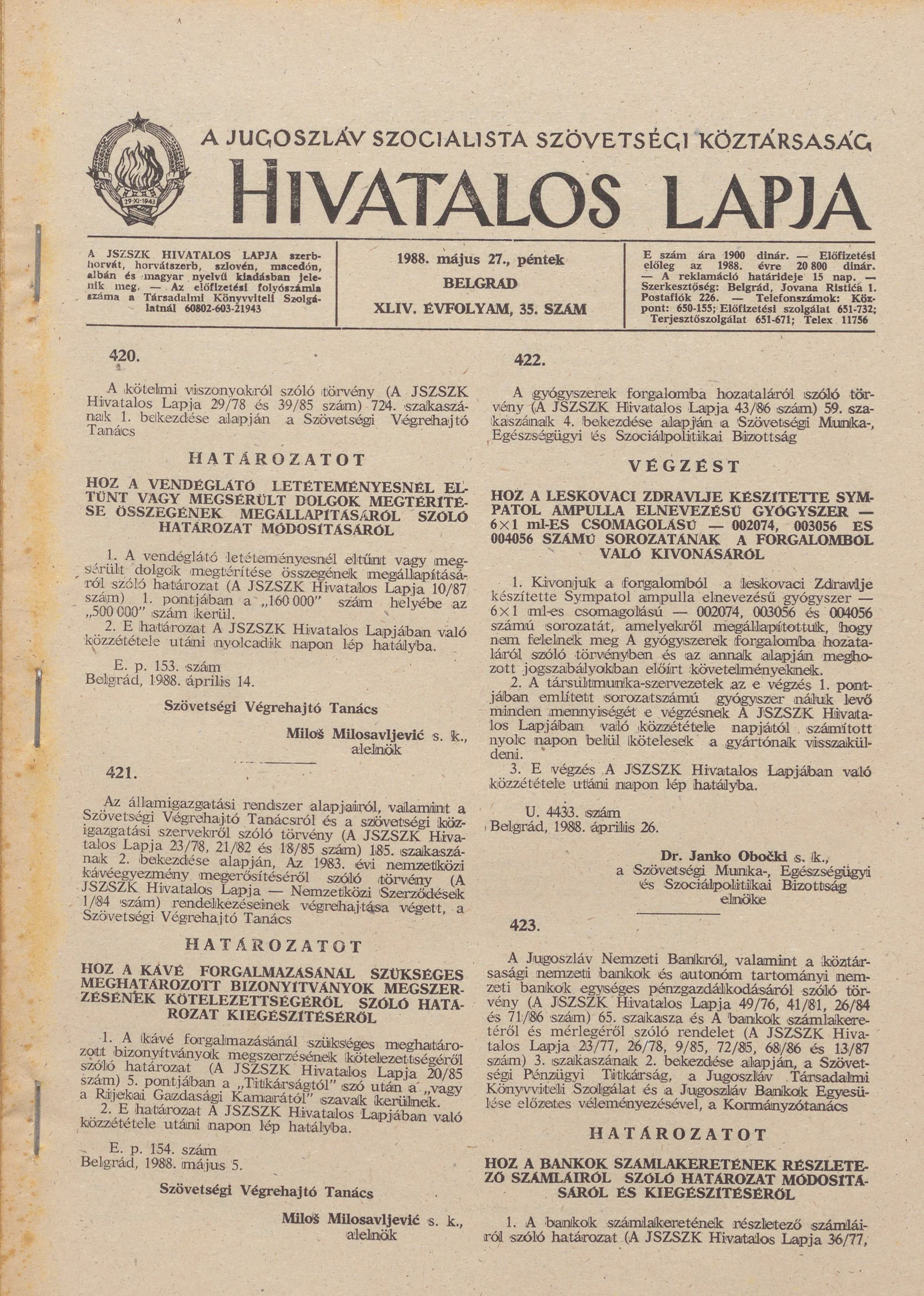 A Jugoszláv Szocialista Szövetségi Köztársaság Hivatalos Lapja, 44. évf. 1988. május 27. 35. sz. 917–996. oldal