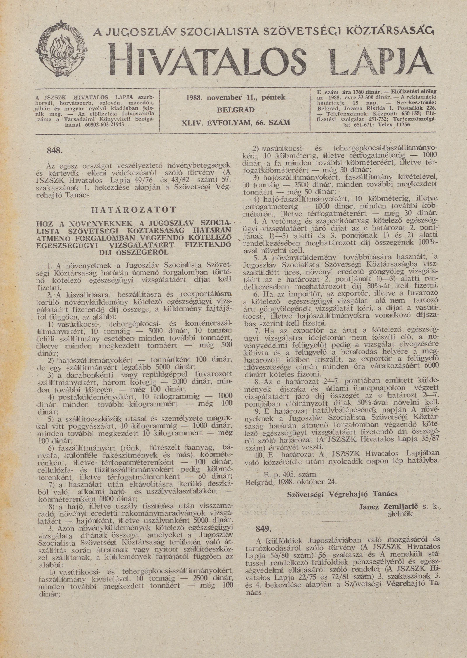 - Határozat a növényeknek a Jugoszláv Szocialista Szövetségi Köztársaság határán átmenő forgalomban végzendő kötelező egészségügyi vizsgálatért fizetendő díj összegéről1657