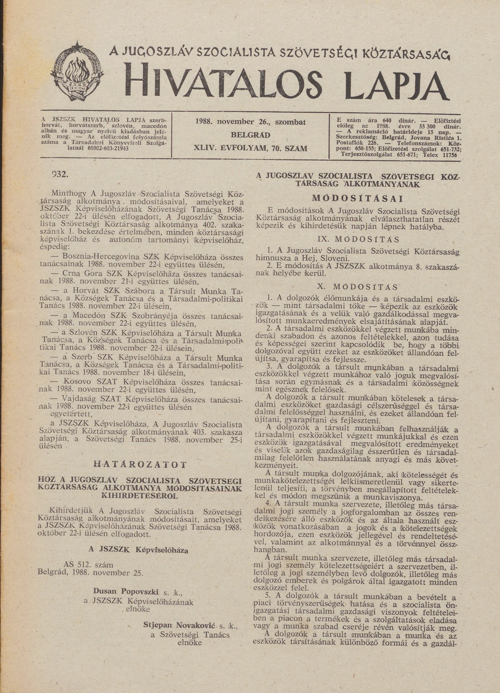 A Jugoszláv Szocialista Szövetségi Köztársaság Hivatalos Lapja, 44. évf. 1988. november 26. 70. sz. 1793–1808. oldal