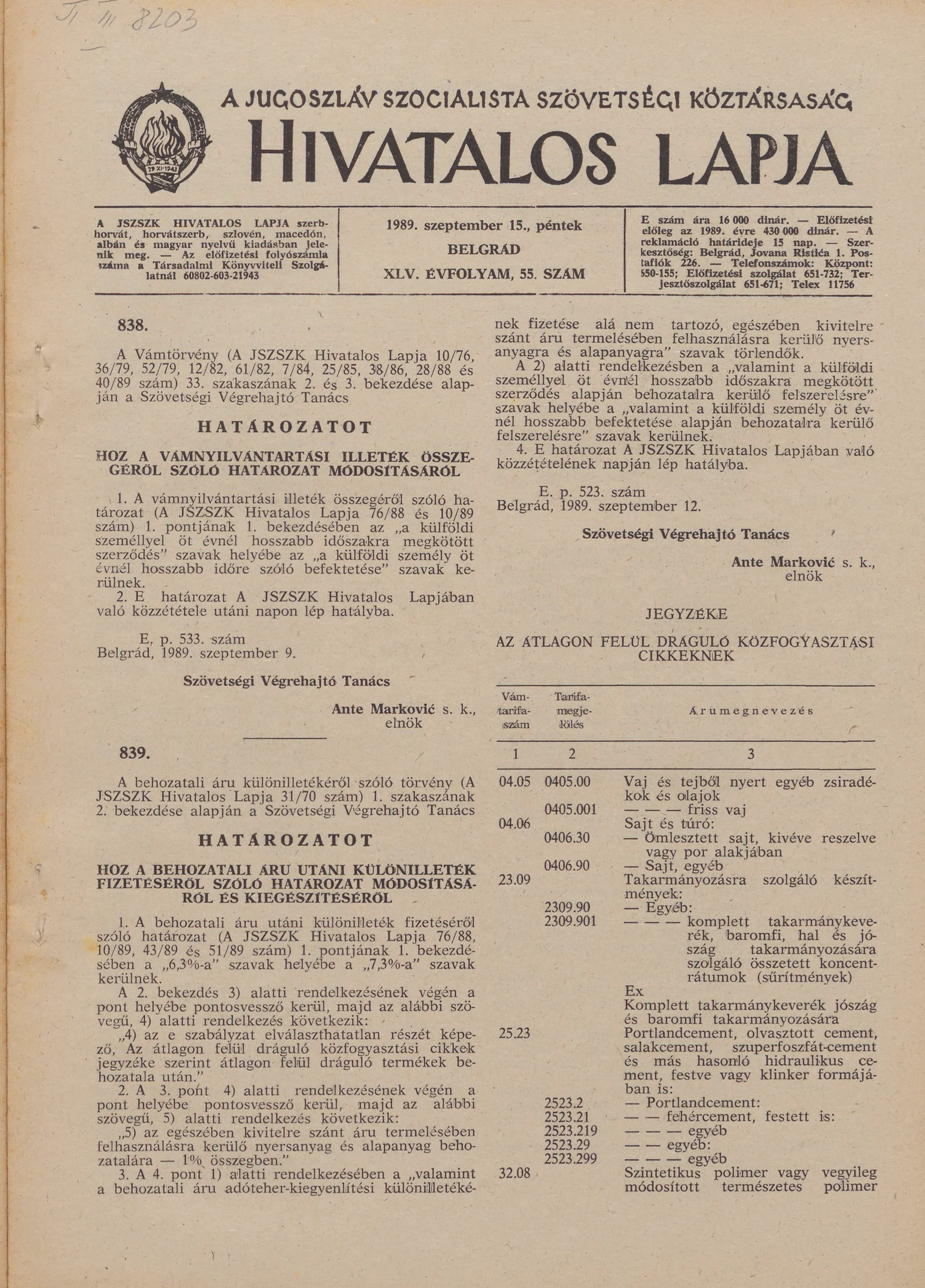 A Jugoszláv Szocialista Szövetségi Köztársaság Hivatalos Lapja, 45. évf. 1989. szeptember 15. 55. sz. 1345–1392. oldal