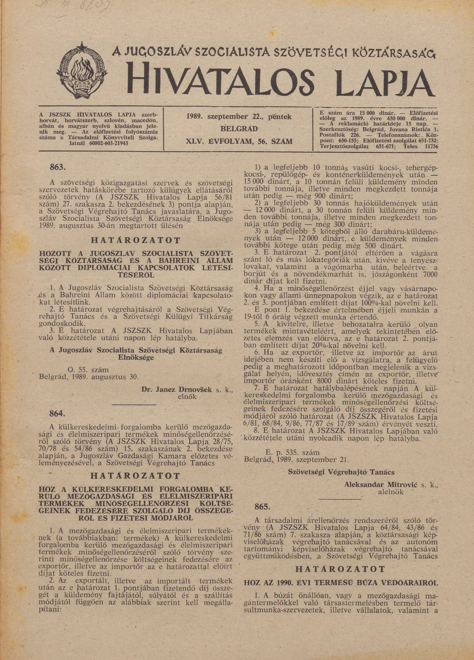 A Jugoszláv Szocialista Szövetségi Köztársaság Hivatalos Lapja, 45. évf. 1989. szeptember 22. 56. sz. 1339–1436. oldal