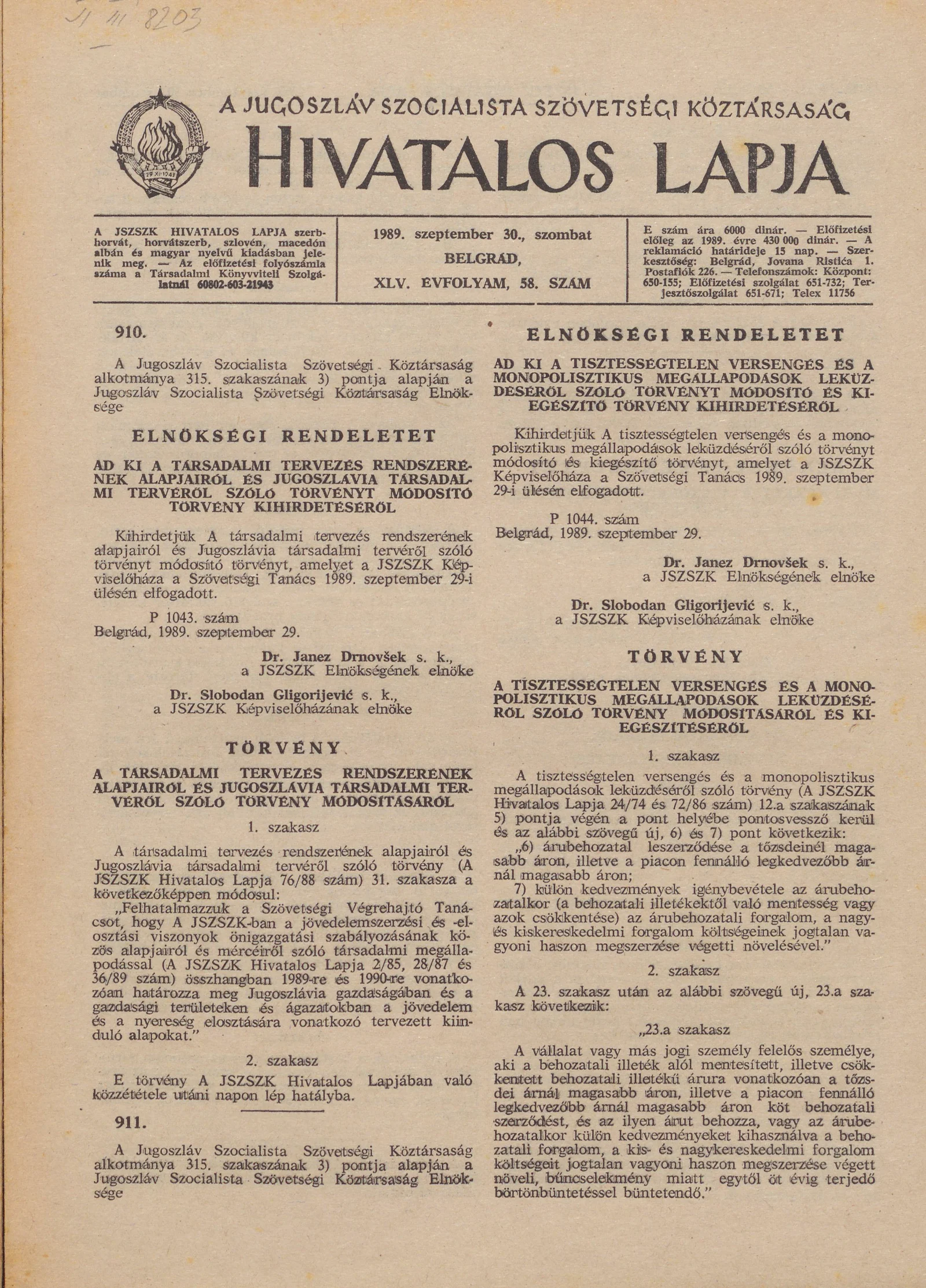 A Jugoszláv Szocialista Szövetségi Köztársaság Hivatalos Lapja, 45. évf. 1989. szeptember 30. 58. sz. 1457–1464. oldal