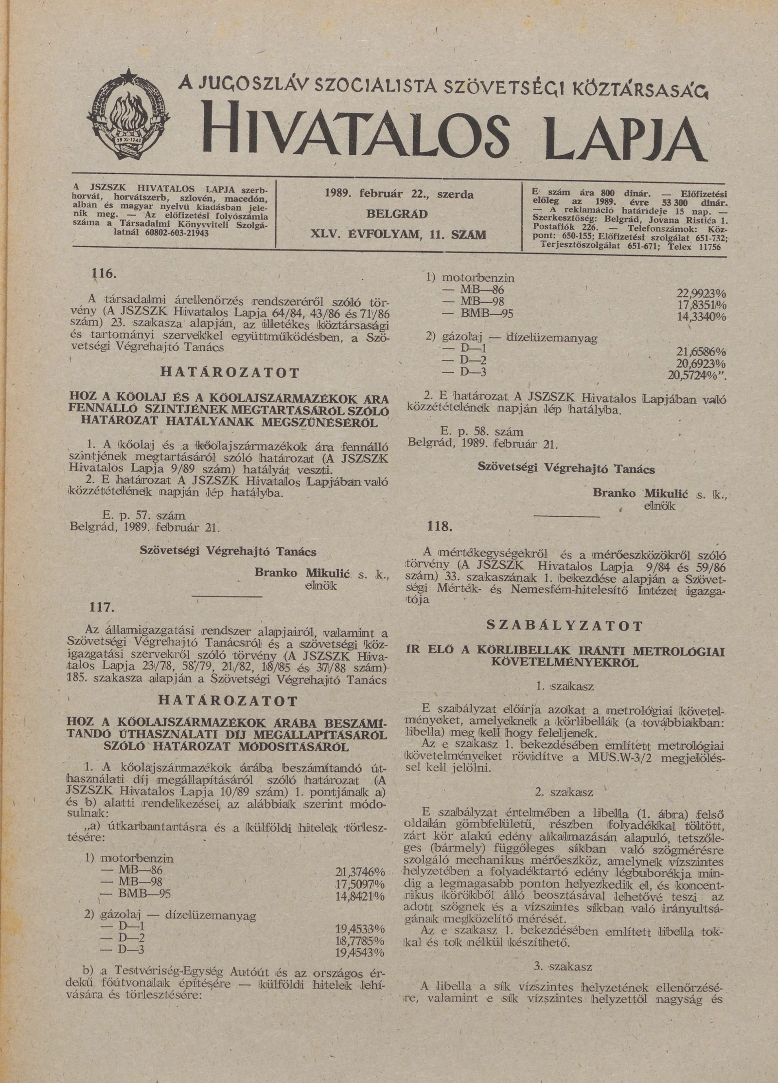 A Jugoszláv Szocialista Szövetségi Köztársaság Hivatalos Lapja, 45. évf. 1989. február 22. 11. sz. 273–276. oldal