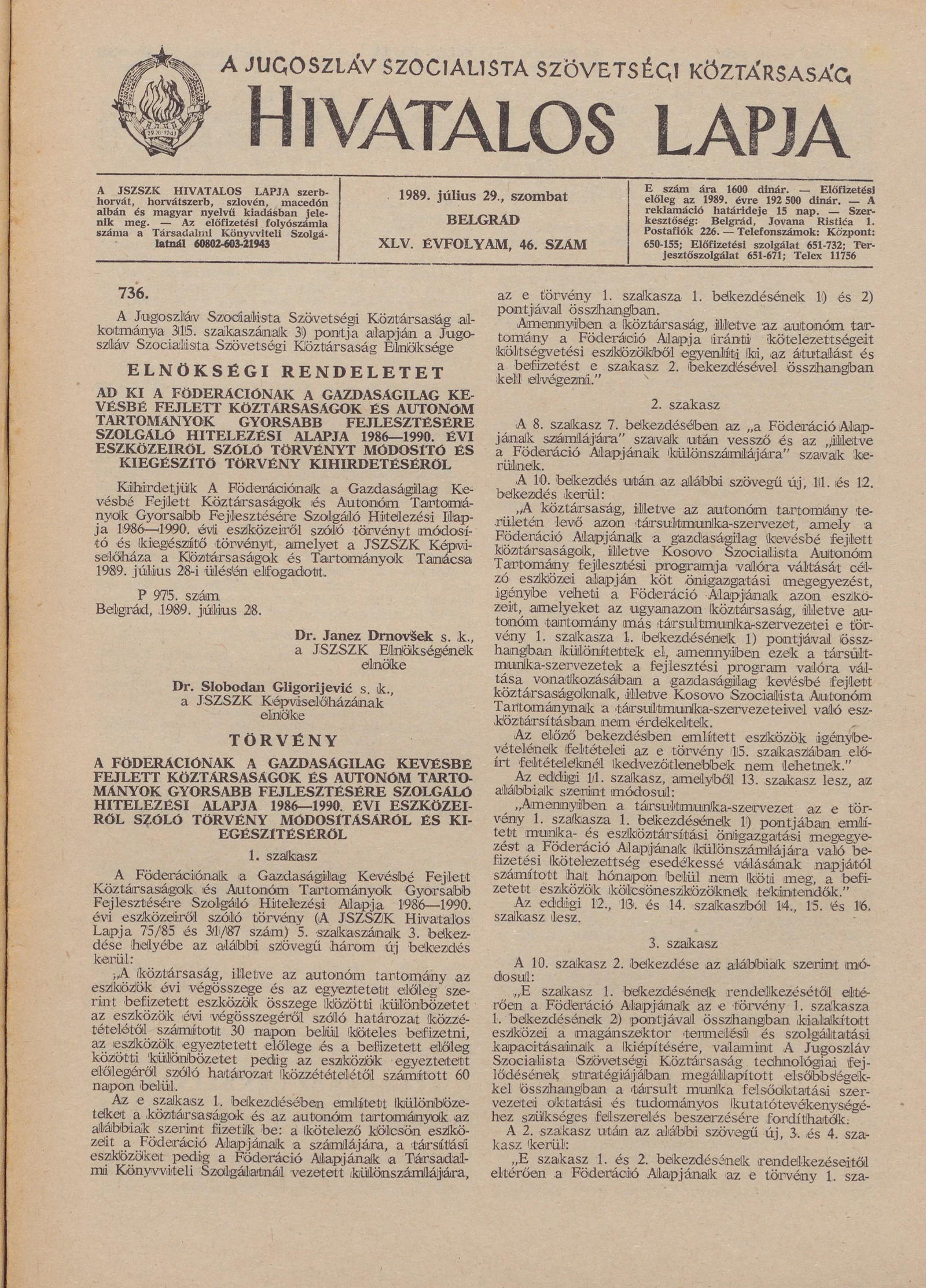 A Jugoszláv Szocialista Szövetségi Köztársaság Hivatalos Lapja, 45. évf. 1989. július 29. 46. sz. 1201–1208. oldal